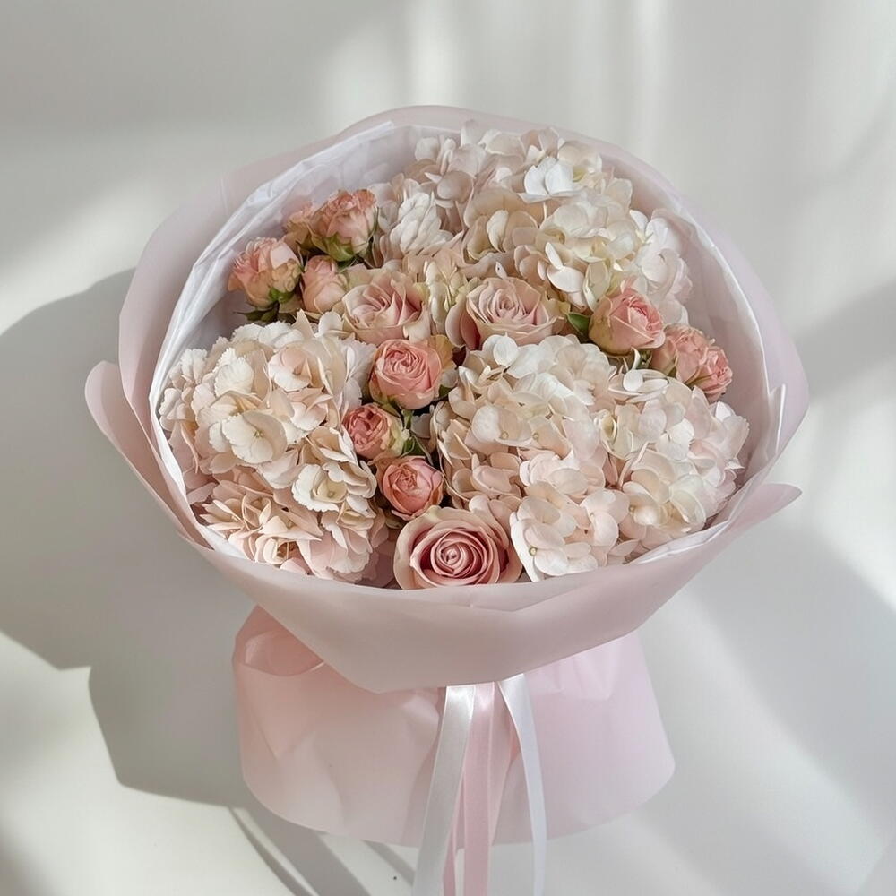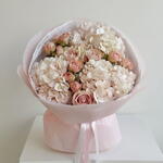 hydrangeas white - 3 pcs spray roses (kenya) - 3 pcs rose dusty rose - 3 pcs
