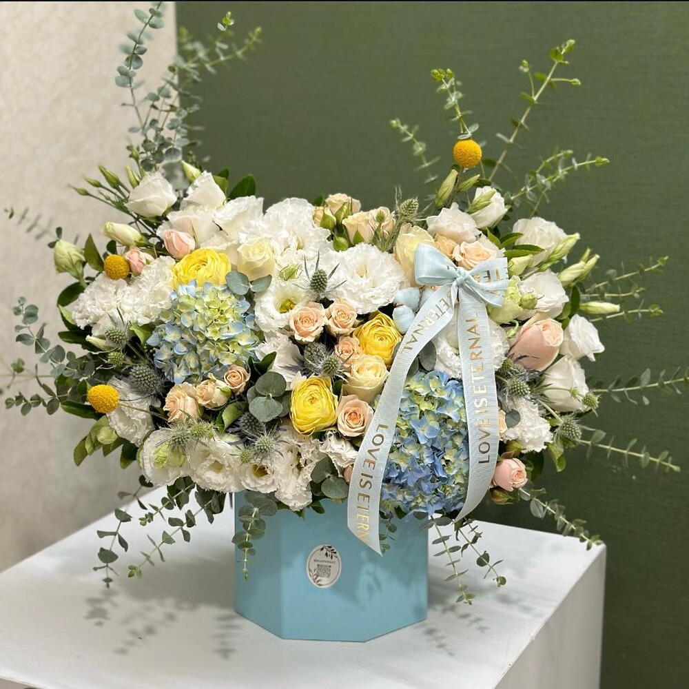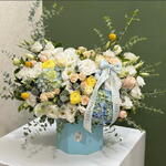 A dreamy pastel arrangement featuring blush roses, sunny yellow blooms, airy blue hydrangeas, and lush white florals. Accented with eucalyptus and tied with a satin ribbon, this box captures the beauty of a serene spring morning.