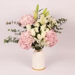 3 Pink Hydrangeas, 9 White Roses, 2 Stems White Oriental Lilies, 2 Stems White Statice, 2 Stems Baby Blue Eucalyptus, Prepared in a Premium Ceramic Glass Vase - 11.5x20cm.