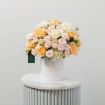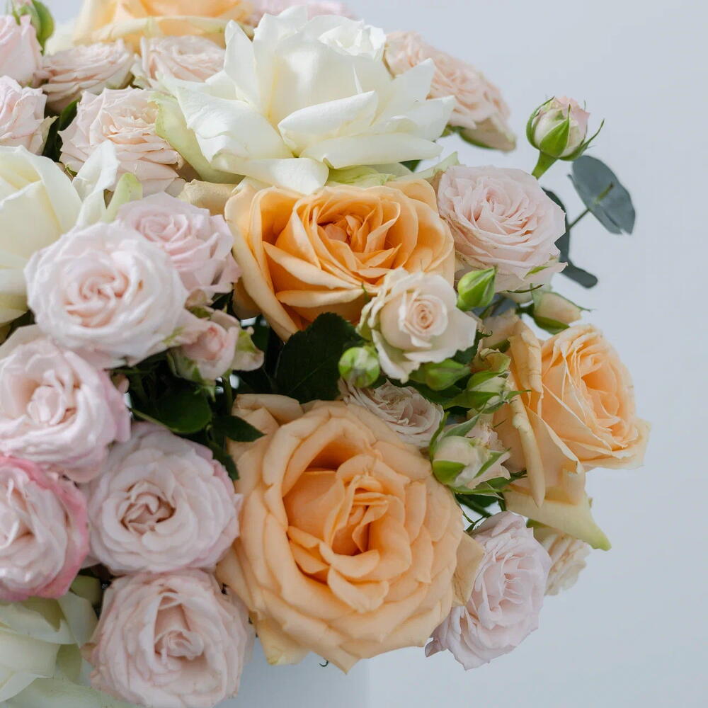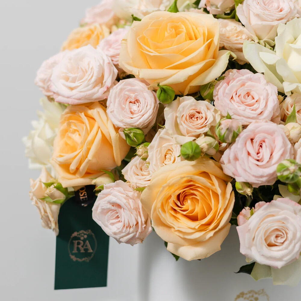 A stunning dome of premium pastel roses — Antonina, Bombastic, Avalanche, and Peach Avalanche — beautifully arranged in our Rose Art signature box. This bouquet combines soft peach, cream, and blush tones to create an arrangement that radiates sophistication and joy. Perfect for weddings, anniversaries, birthdays, or elegant celebrations. Also a refined choice for thank you gestures, corporate gifting, or get well soon wishes. ✅ Luxury Rose Box Collection ✅ 1-Hour Express Delivery (Dubai) ✅ Freshly Cut Hand Delivered ✅ Long-Stem Premium Roses ✅ Naturally Fragrant Blooms with Eucalyptus ✅ Free Delivery in Dubai