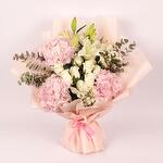 Ribbon - 1 pcs White rose - 9 pcs pink hydrangea - 3 pcs white oriental lilies - 2 pcs pink wrapping - 1 pcs white statice - 2 pcs baby eucalyptus - 2 pcs