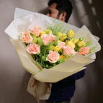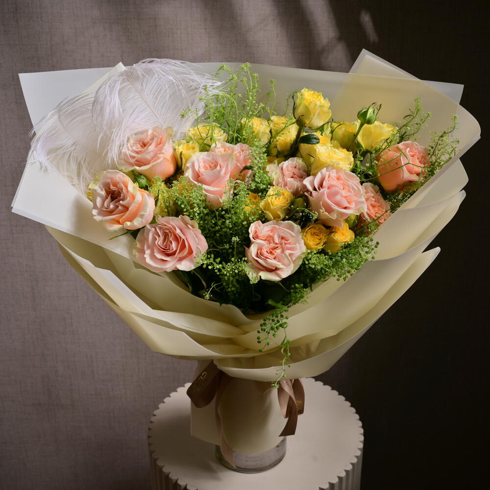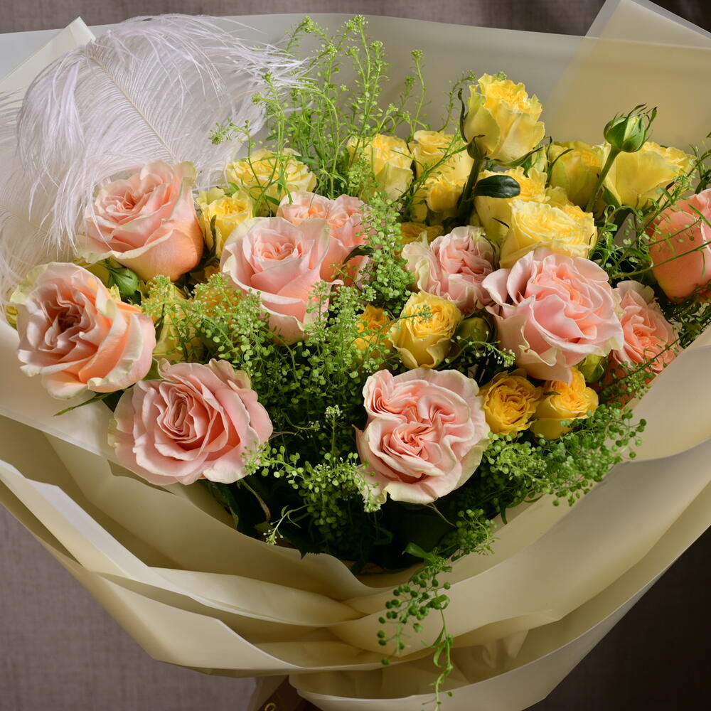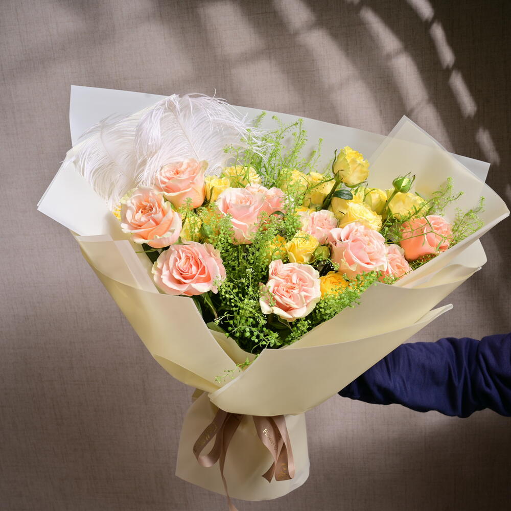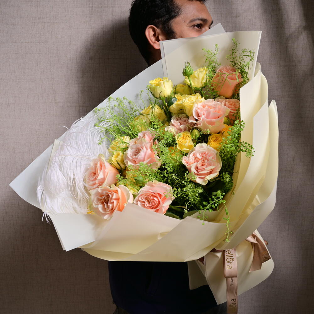 The Pastel Rose Yellow Spray Roses Bouquet features a harmonious blend of 11 pastel Ecuadorian roses and 5 yellow spray roses, accented with 3 stems of vibrant green Lepidium. This charming arrangement is wrapped in soft, elegant paper and finished with a Fellora ribbon, perfect for celebrating love, joy, and special occasions.
