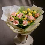 yellow spray roses - 5 pcs pastel ecuadorian roses - 11 pcs wrapping paper layers - 5 pcs fellora ribbon - 1 pcs stems of green lepidium - 3 pcs