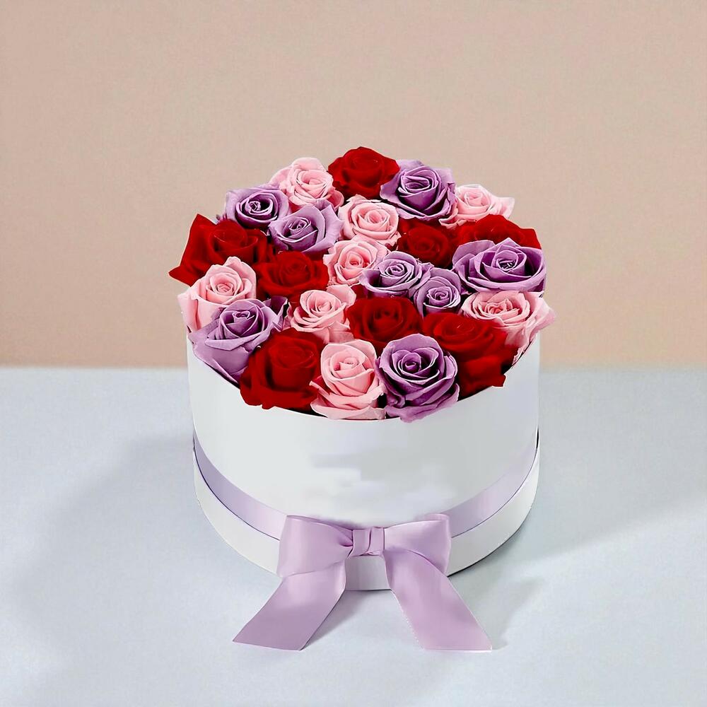 white box - 1 pcs sweet pink rose - 9 pcs red roses - 9 pcs purple roses - 9 pcs