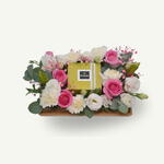 A mixture of 5 white carnations, 5 pink roses, 3 white lisianthus, 1 white lilies stem, pink gypsophila, eucalyptus and assorted Patchi chocolate box gently crafted on a tray.