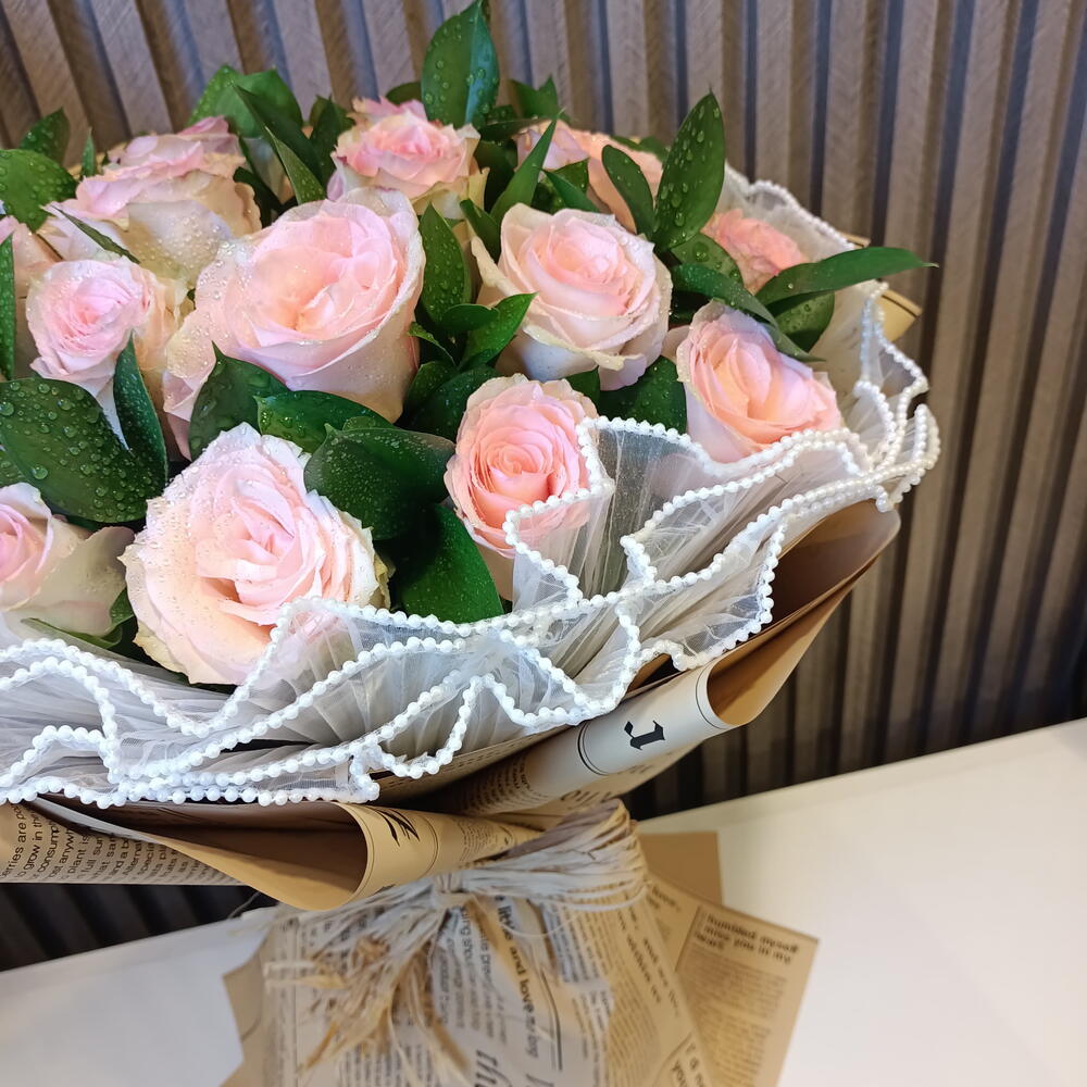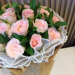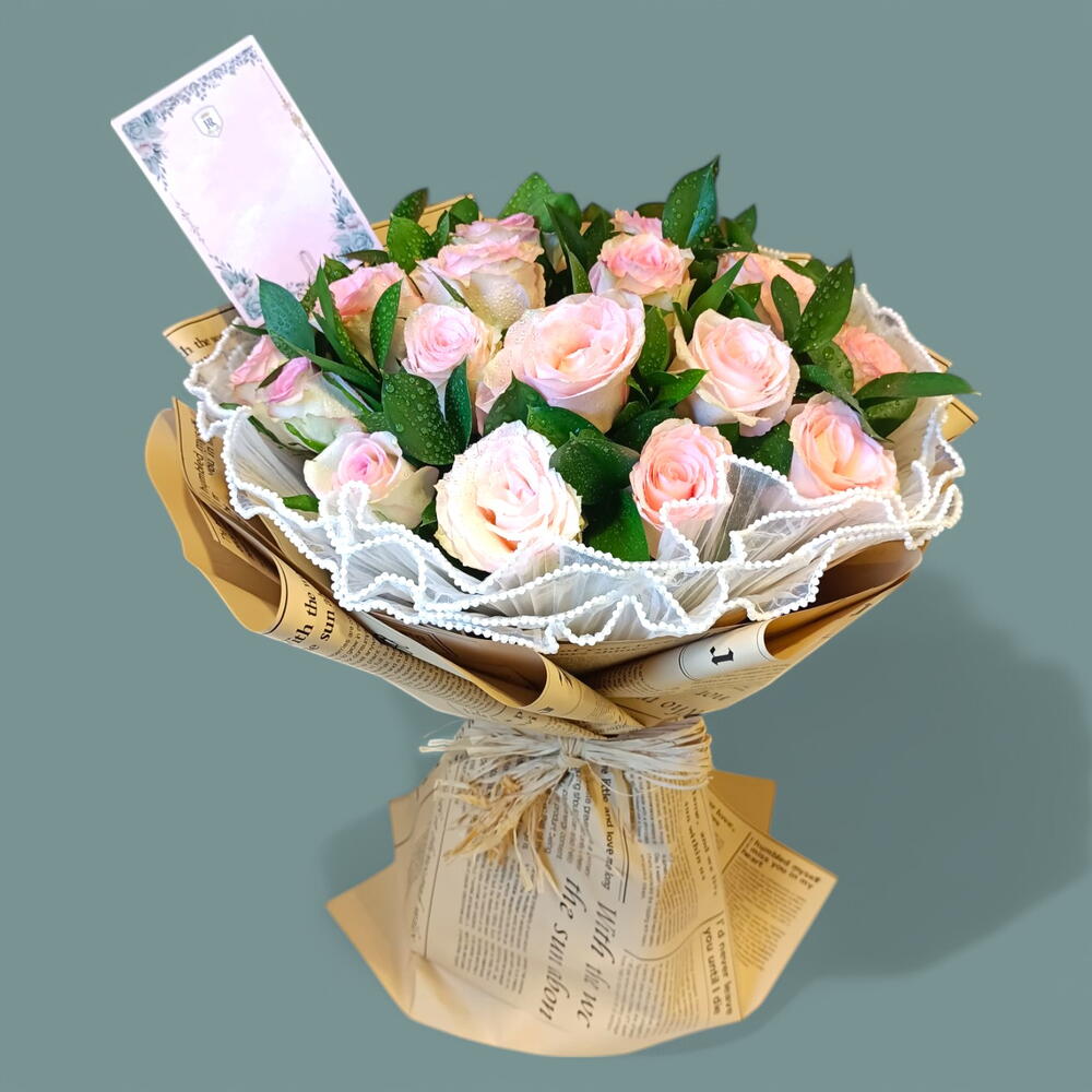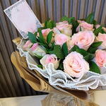 Find tranquility in the delicate beauty of this serene rose bouquet. Soft pastel hues create a calming and peaceful atmosphere, making it the perfect gift for expressing sympathy, offering comfort, or simply sending a message of peace. These exquisite roses are carefully arranged with calming greenery and presented with a touch of elegance.