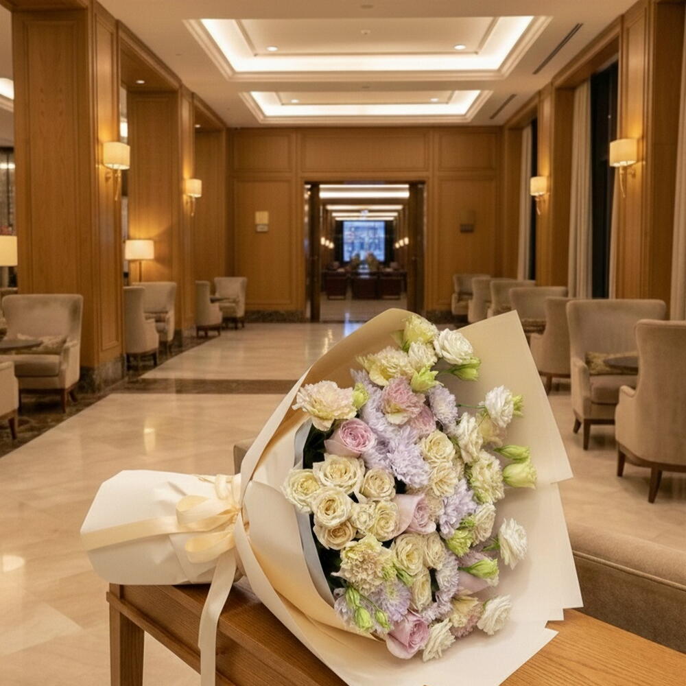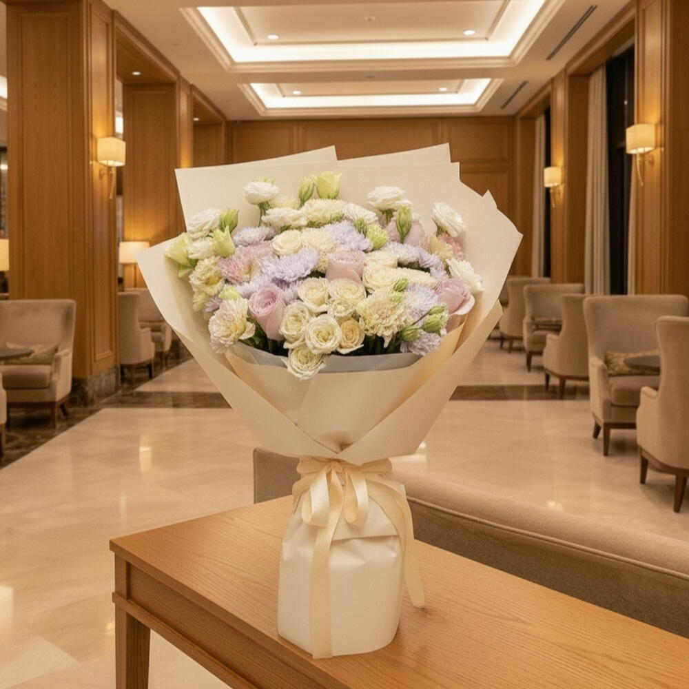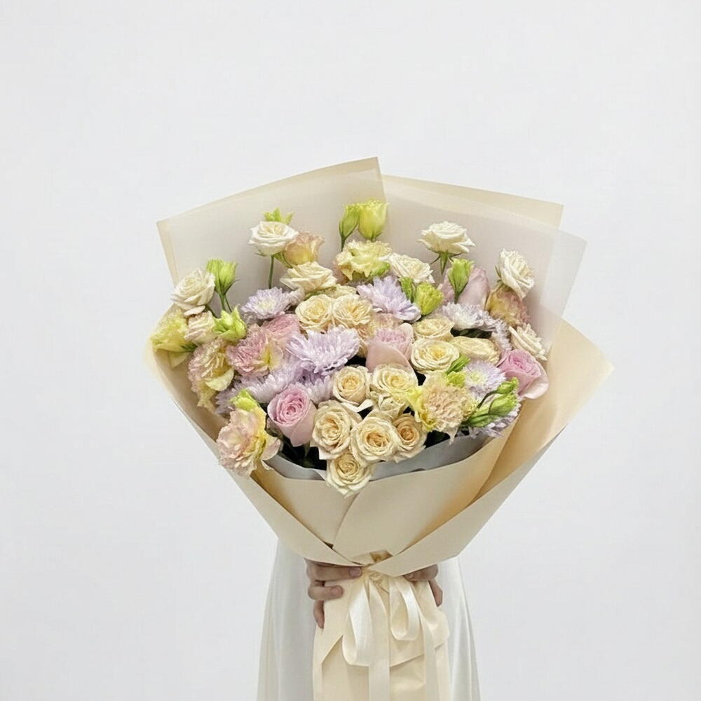 white paper - 3 pcs peach lisianthus - 6 pcs peach baby roses - 5 pcs peach paper - 7 pcs light purple chrysanthemum stemp - 5 pcs light pink roses stems - 5 pcs