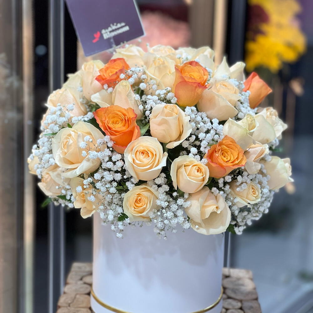 Arrangement of 30 peach roses and 5 orange roses with fillers in a white box. Elegant arrangement of 30 peach roses and 5 orange roses with delicate fillers, beautifully presented in a white box. A vibrant and stylish floral gift perfect for birthdays, anniversaries, or special celebrations. peach and orange rose arrangement, 35 roses bouquet, boxed flower gift, fresh rose delivery. Keep in a cool place away from direct sunlight and heat. Refresh water regularly and remove wilted flowers to maintain freshness.