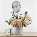 Elegant, charming, and designed to impress — the Peach Blossom Birthday Flower Box Chocolate Combo is the ultimate birthday gift. This beautifully arranged flower box features 5 peach roses, 5 peach carnations, and 5 peach spray roses, perfectly accented with 3 eucalyptus sprigs to create a soft, fragrant display. Presented in a sleek premium box, the floral arrangement is paired with a luxurious Patchi chocolate box, a birthday greeting card, and a Happy Birthday helium balloon, making it a complete celebration-in-a-box. It’s a thoughtful and elegant gesture that captures joy, affection, and celebration. Care Instructions: Place the box in a cool, shaded area away from direct sunlight and heat. Refill water in the floral foam every 1-2 days to keep the blooms hydrated. Remove any wilted petals gently to maintain the freshness and appearance of the arrangement for as long as possible.