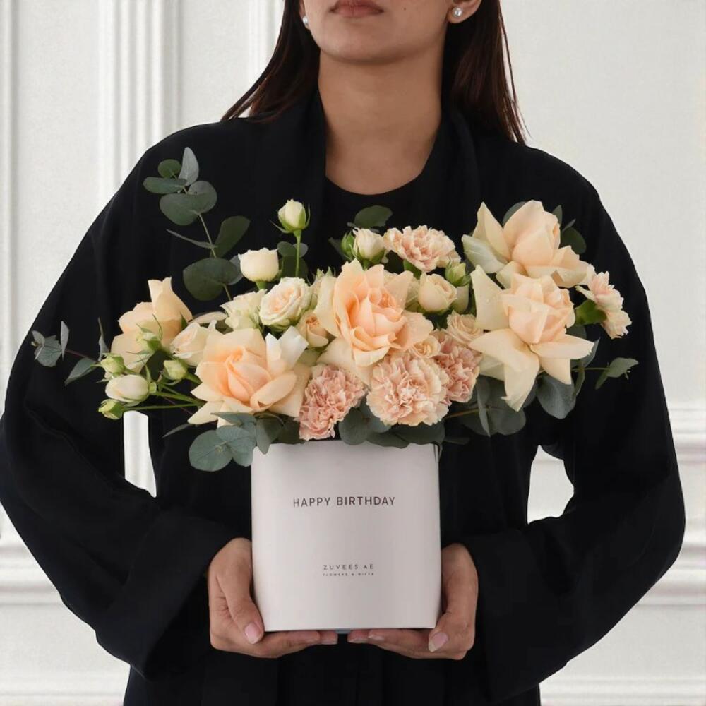 Elegant, charming, and designed to impress — the Peach Blossom Birthday Flower Box Chocolate Combo is the ultimate birthday gift. This beautifully arranged flower box features 5 peach roses, 5 peach carnations, and 5 peach spray roses, perfectly accented with 3 eucalyptus sprigs to create a soft, fragrant display. Presented in a sleek premium box, the floral arrangement is paired with a luxurious Patchi chocolate box, a birthday greeting card, and a Happy Birthday helium balloon, making it a complete celebration-in-a-box. It’s a thoughtful and elegant gesture that captures joy, affection, and celebration. Care Instructions: Place the box in a cool, shaded area away from direct sunlight and heat. Refill water in the floral foam every 1-2 days to keep the blooms hydrated. Remove any wilted petals gently to maintain the freshness and appearance of the arrangement for as long as possible.
