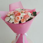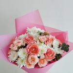 Soft, feminine, and beautifully gift-ready—this charming Pastel Color bouquet is a sweet Mixed flowers bouquet / Mixed flower bouquet with Peach roses (main feature blooms), White chrysanthemums (fluffy daisy-style blooms), Pink carnations (soft ruffled accents) and Eucalyptus greenery (a few leaves on the side) wrapped in elegant pink paper and finished with a ribbon. It’s perfect when you want something light, happy, and classy. Made with premium quality flowers, this is a fresh and elegant Fresh bouquet / Fresh flowers bouquet—a lovely Premium flowers bouquet for any occasion. It’s ideal as a Birthday Bouquet (great for Birthday flowers and Flowers for birthday), and also works beautifully as a Congratulations bouquet with cheerful Congratulations flowers. With its soft tones, it can feel like a gentle Romantic bouquet filled with love and romance flowers, making it a great option for best flowers for anniversary too. A stylish cool bouquet, always a trending bouquet and a truly unique flowers bouquet—perfect for anyone looking for the best bouquet in Dubai.