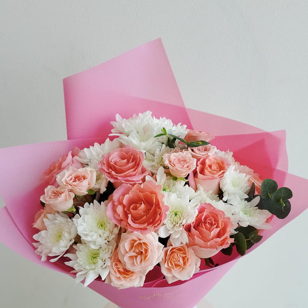 Chrysanthemum white - 4 pcs eucalyptus cineria - 3 pcs white ribbon - 3 pcs sweet sara spray rose - 3 pcs premium pink wrapping - 4 pcs pink hermosa - 7 pcs