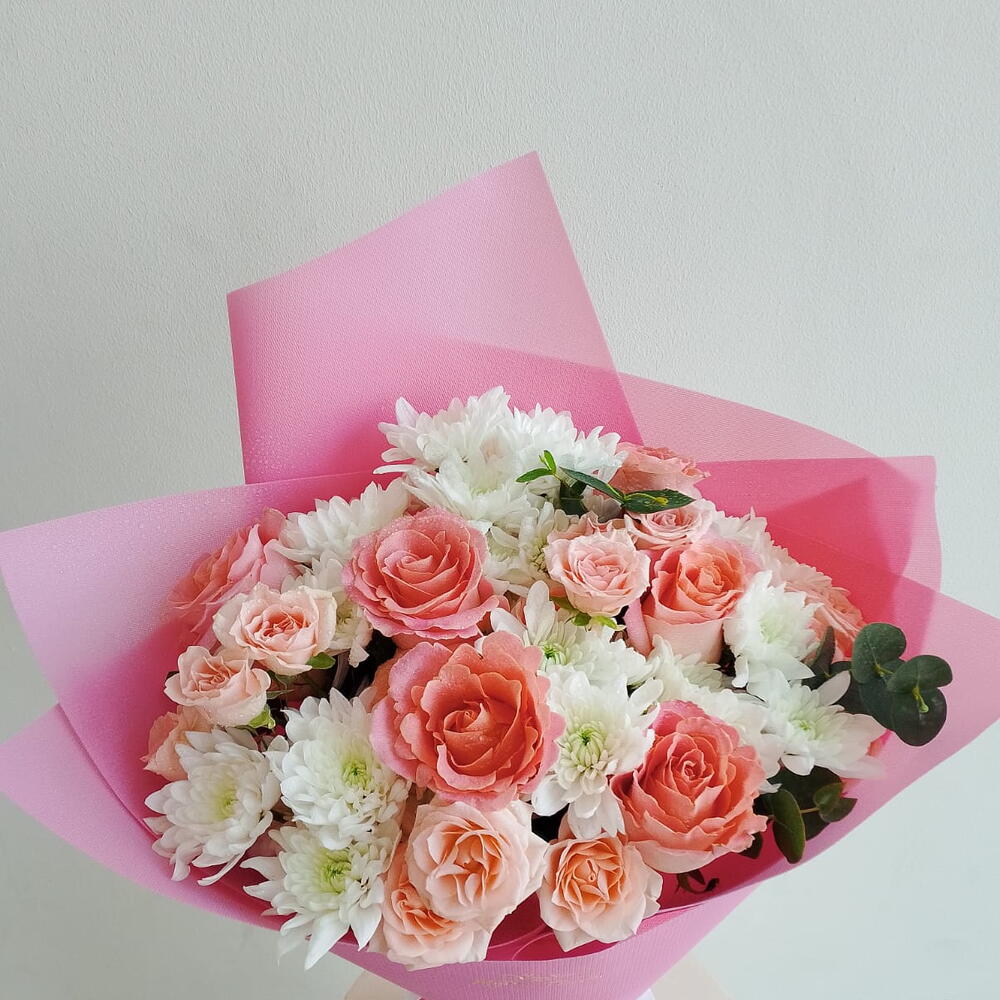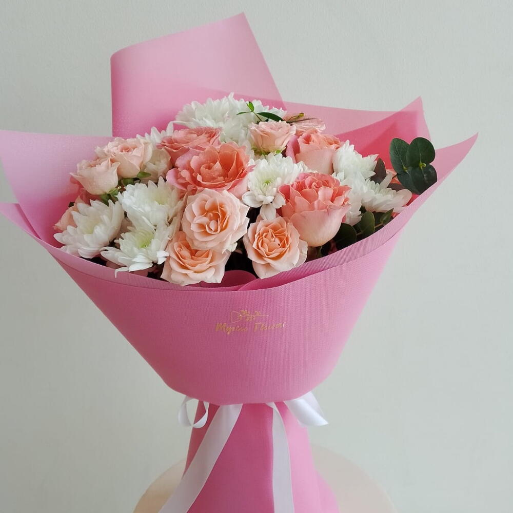 Soft, feminine, and beautifully gift-ready—this charming Pastel Color bouquet is a sweet Mixed flowers bouquet / Mixed flower bouquet with Peach roses (main feature blooms), White chrysanthemums (fluffy daisy-style blooms), Pink carnations (soft ruffled accents) and Eucalyptus greenery (a few leaves on the side) wrapped in elegant pink paper and finished with a ribbon. It’s perfect when you want something light, happy, and classy. Made with premium quality flowers, this is a fresh and elegant Fresh bouquet / Fresh flowers bouquet—a lovely Premium flowers bouquet for any occasion. It’s ideal as a Birthday Bouquet (great for Birthday flowers and Flowers for birthday), and also works beautifully as a Congratulations bouquet with cheerful Congratulations flowers. With its soft tones, it can feel like a gentle Romantic bouquet filled with love and romance flowers, making it a great option for best flowers for anniversary too. A stylish cool bouquet, always a trending bouquet and a truly unique flowers bouquet—perfect for anyone looking for the best bouquet in Dubai.