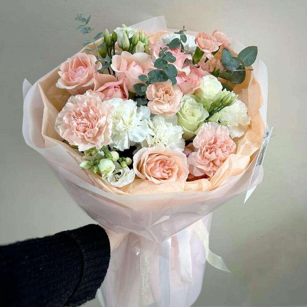 carnation white - 4 pcs eucalyptus leaves - 3 pcs carnation peach - 2 pcs mathiola white - 1 pcs lisanthus white - 2 pcs julietta peach spray rose - 2 pcs spray carnation peach - 1 pcs