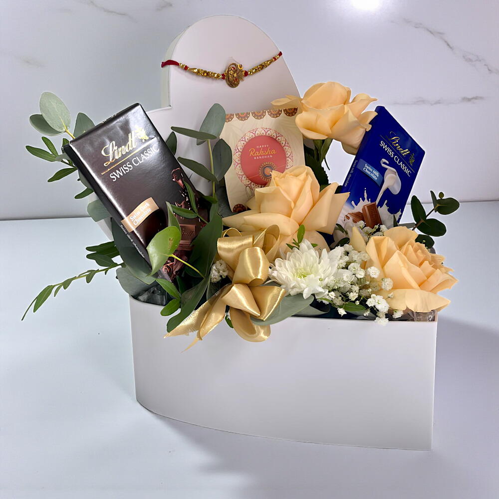 Delight someone special with our Peach Harmony Gift Box, a graceful fusion of floral beauty and gourmet indulgence. Thoughtfully arranged in a luxurious white heart-shaped box, this stunning hamper features three soft peach roses symbolizing warmth, gratitude, and appreciation, paired with a pristine white chrysanthemum that embodies purity, sincerity, and everlasting love. To sweeten the moment, the set includes two premium Lindt Swiss Classic chocolate bars, adding a delicious finishing touch to this heartfelt gift. Fresh gypsophila and aromatic eucalyptus leaves complete the arrangement, offering a natural fragrance and lush texture that elevate the experience. Whether you’re celebrating a birthday, anniversary, friendship, or simply sending love “just because,” the Peach Harmony Gift Box is a timeless way to express heartfelt emotions with elegance and style. ✨ Highlights: 🌸 3 premium peach roses – symbols of gratitude affection 🤍 1 pristine white chrysanthemum – purity sincerity 🍫 2 luxurious Lindt Swiss Classic chocolate bars 🌿 Fresh gypsophila and eucalyptus for a fragrant finish 🎁 Presented in a chic white heart box – ready to gift 💝 Make any occasion unforgettable. Click “Add to Cart” now to send the Peach Harmony Gift Box and share a moment of warmth, sweetness, and timeless love.