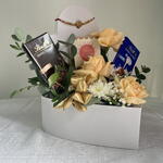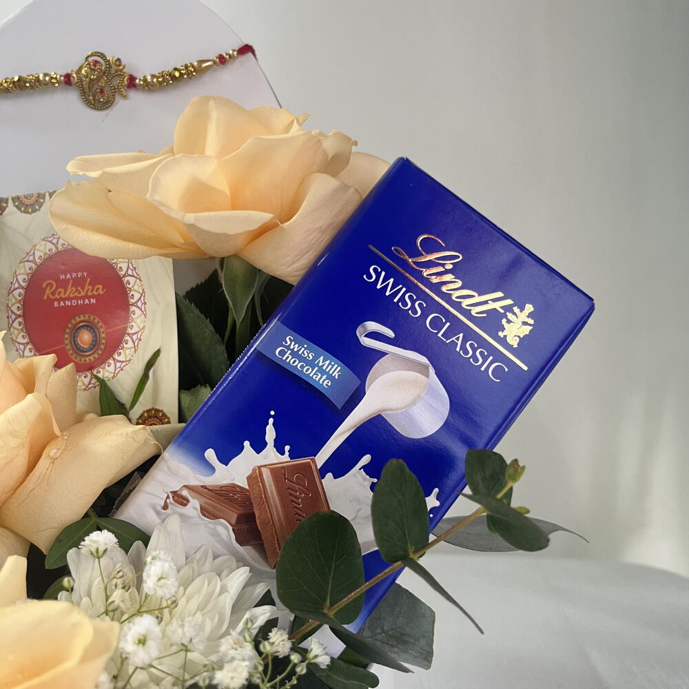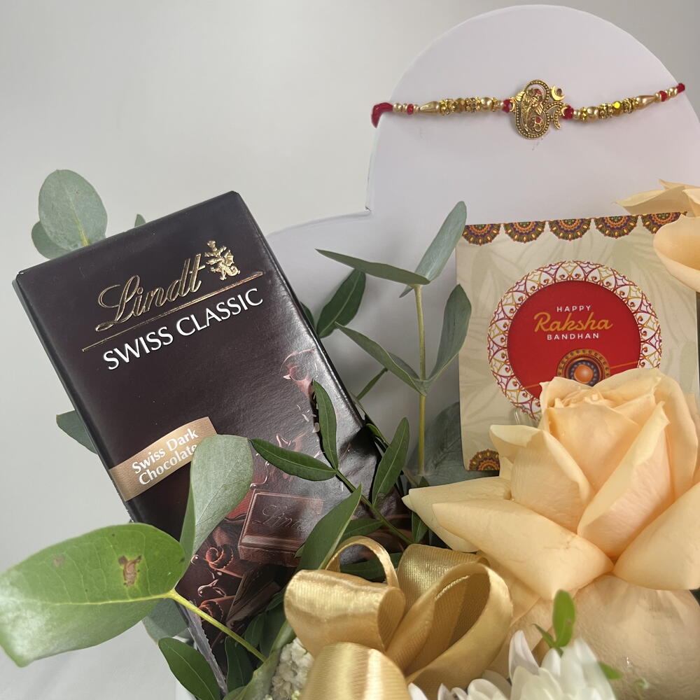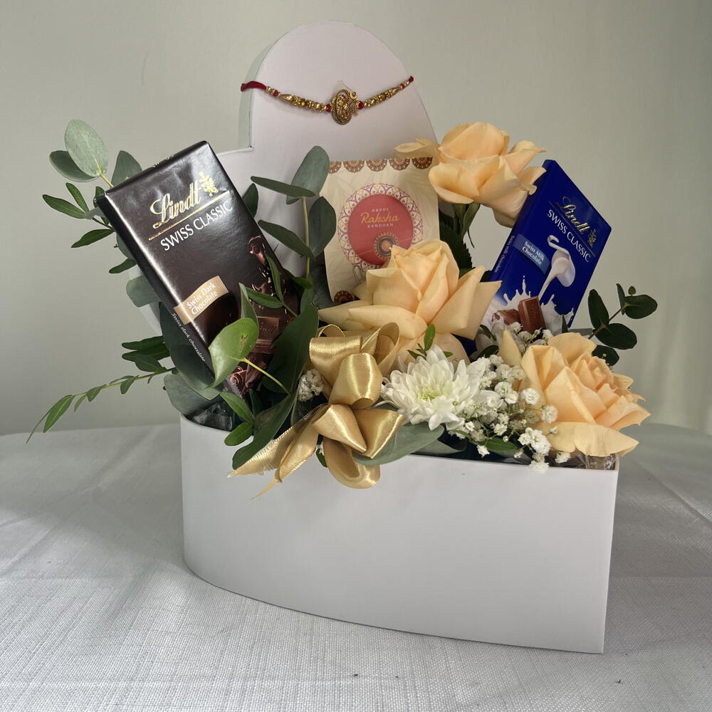 Celebrate life’s special moments with our Peach Harmony Gift Box — a graceful blend of sweetness, elegance, and charm. Arranged in a stylish white heart box, this thoughtful hamper features 3 soft peach roses radiating warmth and appreciation, paired with a single pristine white chrysanthemum to symbolize purity and love. Two indulgent Lindt Swiss Classic chocolate bars add a rich, sweet touch, while fresh gypso and eucalyptus leaves bring a refreshing, natural aroma. Perfect for birthdays, anniversaries, or “just because” surprises, this gift is a beautiful expression of love and thoughtfulness.