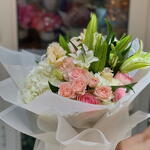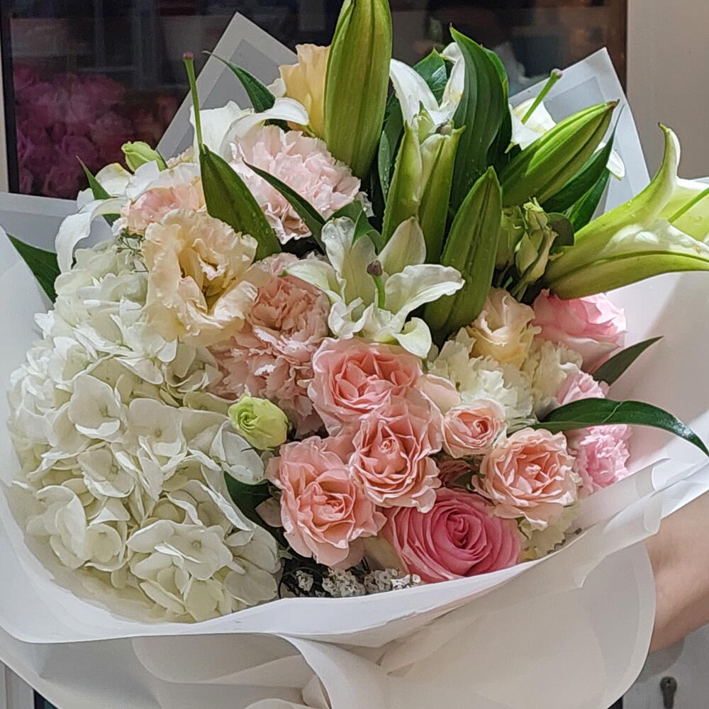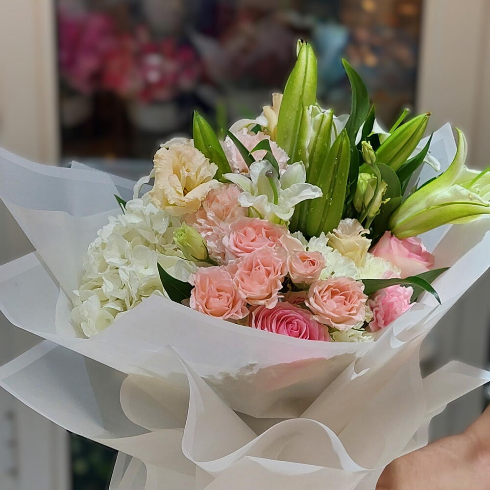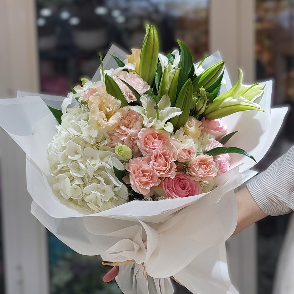 White lilies - 3 pcs pink carnations - 3 pcs white hydrangea - 1 pcs pink roses - 3 pcs pink baby roses - 2 pcs peach lisianthus - 3 pcs