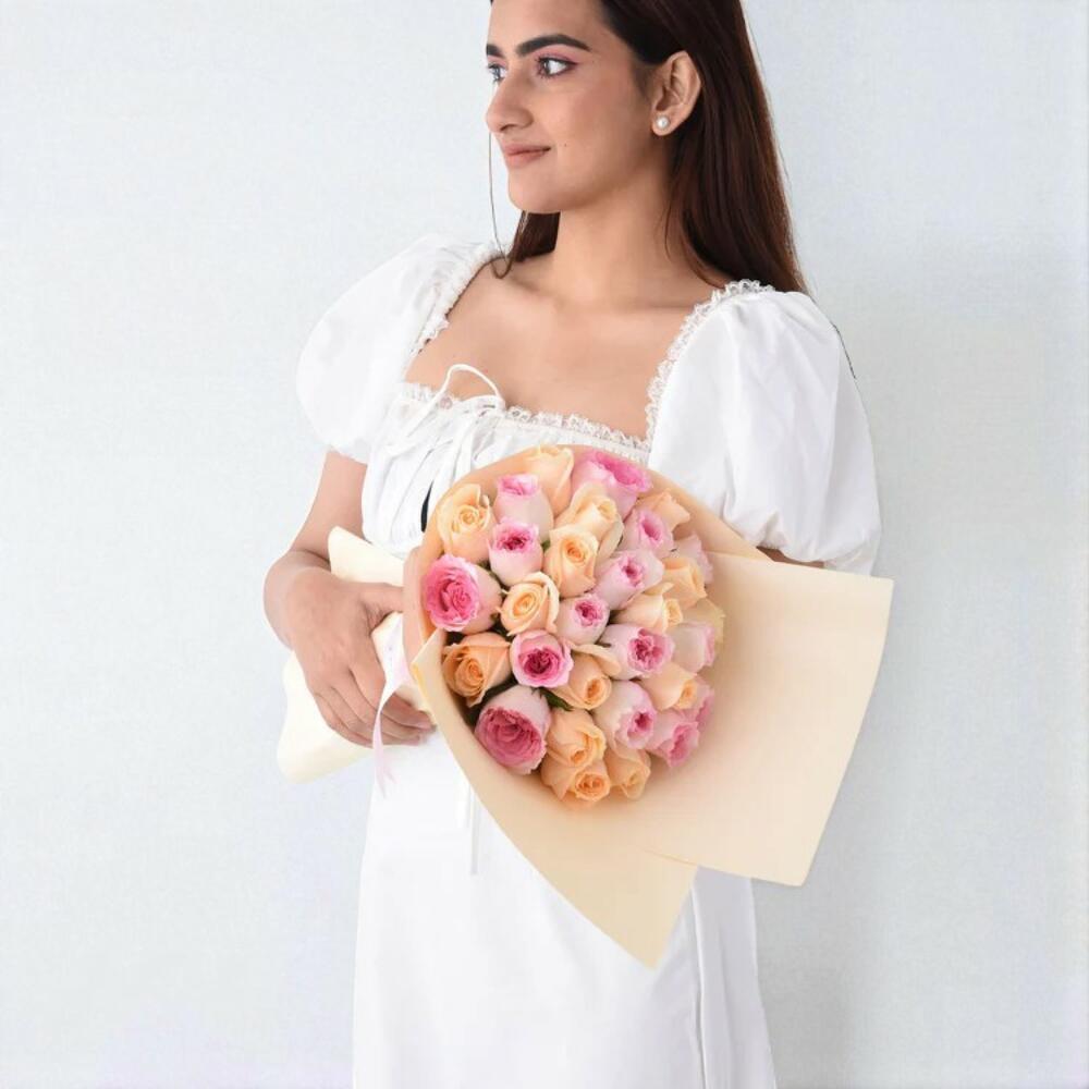 Graceful and feminine, the Peach Pink Delight Bouquet features a charming medley of soft peach and romantic pink roses, creating a bouquet that radiates warmth, love, and timeless beauty. Wrapped in delicate cream-toned paper and tied with a satin ribbon, this hand-tied rose bouquet is ideal for birthdays, thank-you gifts, romantic surprises, or simply to say “you matter.” Crafted to impress, this pastel rose arrangement is perfect for wives, girlfriends, mothers, or anyone who appreciates floral elegance. Care Instructions To maintain the beauty of your bouquet, trim 1–2 cm from each stem at a 45-degree angle before placing in a clean vase filled with fresh, room-temperature water. Refresh the water every 1–2 days and keep the bouquet away from direct sunlight, heat, and strong drafts. Remove any wilted petals to allow the rest to stay fresh longer.