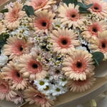 daisies - 7 pcs wrapping paper - 5 pcs peach gerbera - 20 pcs eulcyptus - 4 pcs white chrysanthemum small - 9 pcs