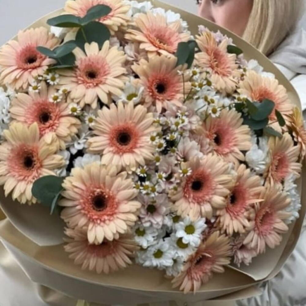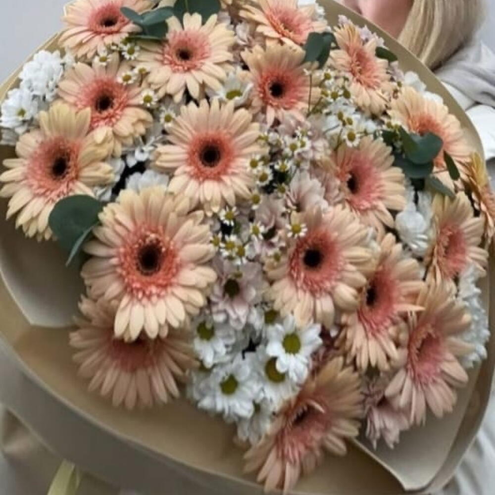 daisies - 7 pcs wrapping paper - 5 pcs peach gerbera - 20 pcs eulcyptus - 4 pcs white chrysanthemum small - 9 pcs