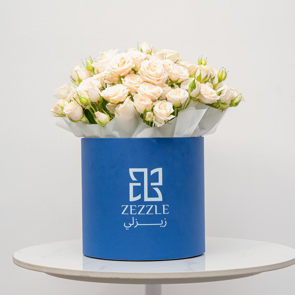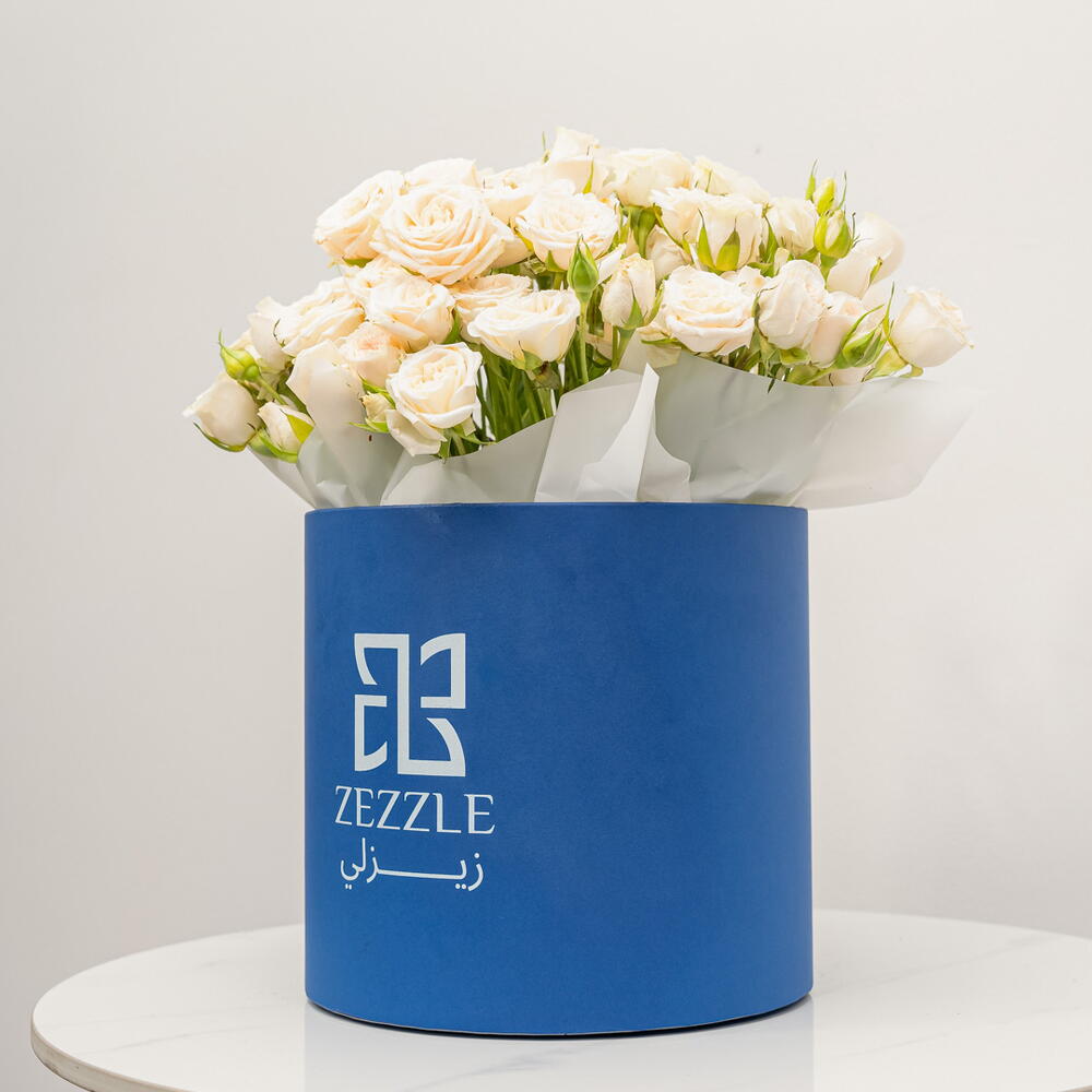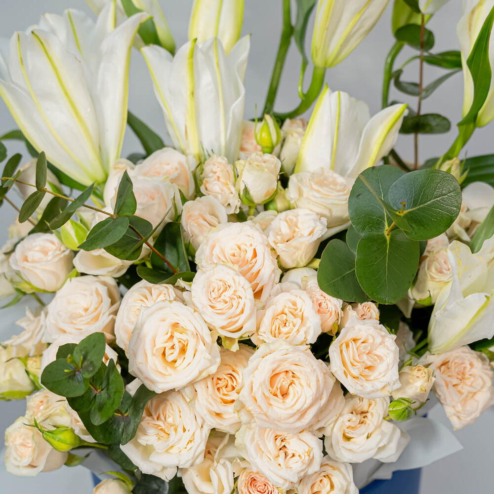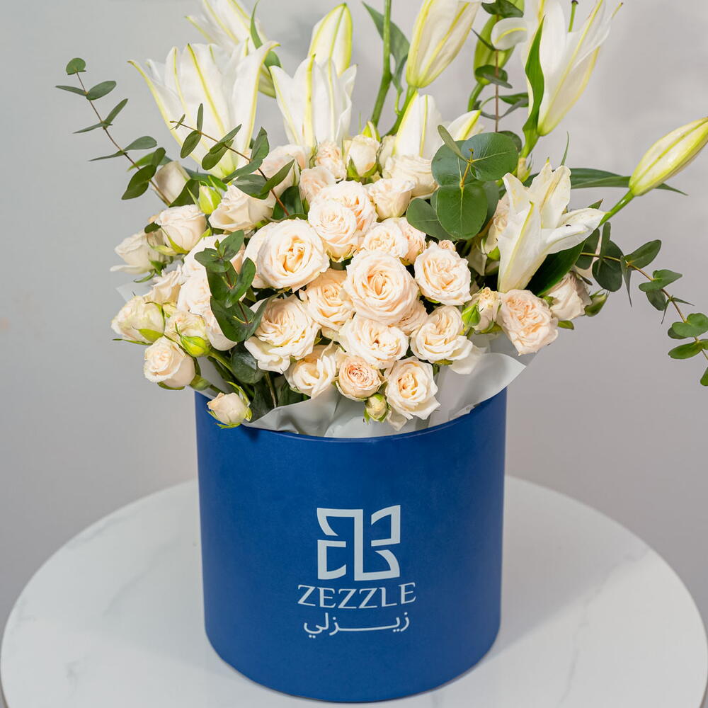 This exquisite arrangement inside a blue Zezzle flower box showcases 5 elegant white lilies and 15 soft peach spray roses. The white lilies symbolize purity and renewal, while the peach spray roses add a touch of warmth, affection, and charm. The blend of these gentle tones creates a harmonious and uplifting display, with the blue Zezzle box providing a striking contrast that enhances the beauty of the flowers. This graceful bouquet is perfect for expressing admiration, love, and joy, making it an ideal gift for any celebration or heartfelt occasion.