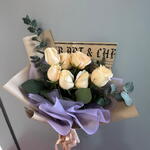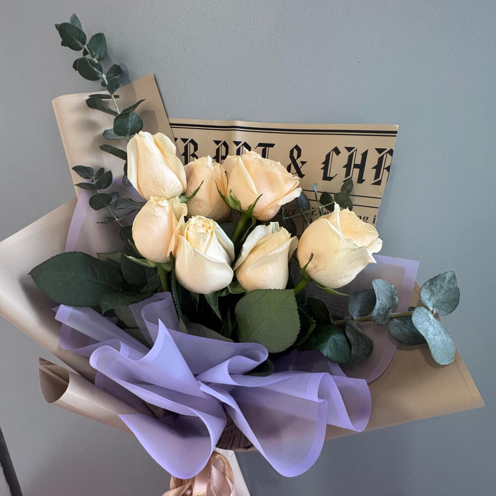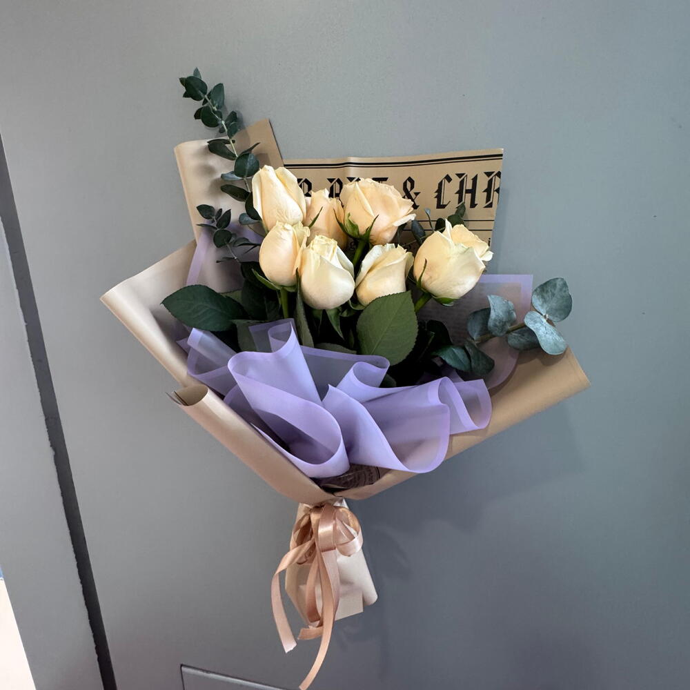 A soft, elegant bouquet of six creamy white roses tucked with lush green leaves and silvery eucalyptus sprigs, wrapped in delicate lavender tissue paper and beige kraft paper, creating a refined, romantic feel.