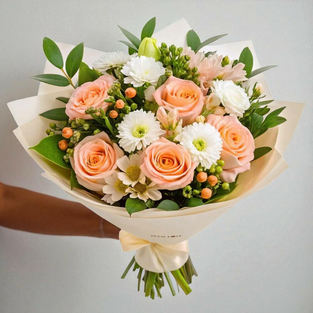 This bouquet is a true embodiment of tenderness and charm, featuring delicate peach roses and cheerful white daisies, highlighted by soft pink blooms and fresh greenery. The combination of pastel tones with accents of lush greens makes it a perfect gift for any special occasion. Its elegant wrapping in creamy paper with a satin bow adds a sophisticated finish. Place it in your home to create a warm, welcoming atmosphere or gift it to bring joy and admiration. To keep the bouquet fresh, cut the stems diagonally before placing them in a clean vase with fresh water, and change the water every 2–3 days. Keep away from direct sunlight and drafts for maximum freshness.