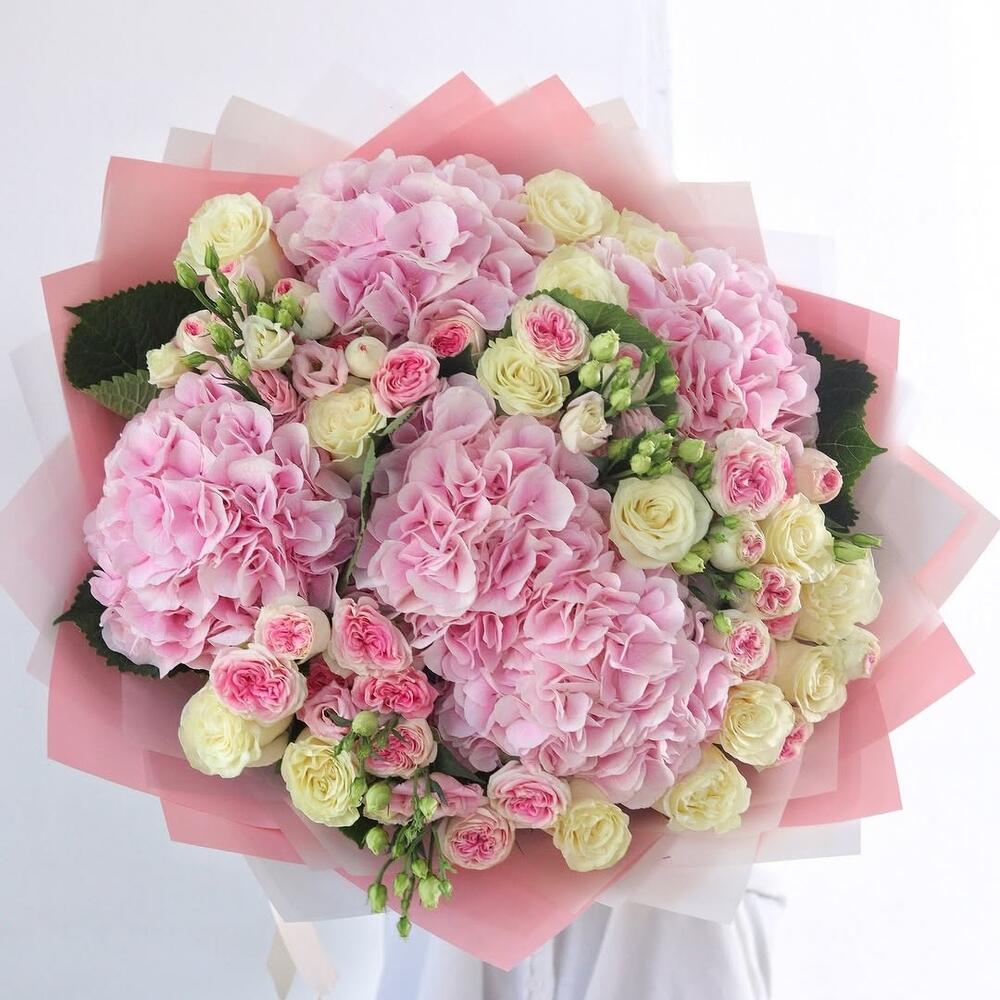 pink spray rose - 5 pcs white lisianthus - 5 pcs pink hydrangea - 5 pcs white roses - 15 pcs