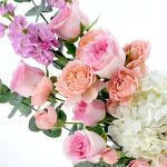 white hydrangeas - 2 pcs sprigs of eucalyptus - 4 pcs stems of pink matthiola - 3 pcs pink mandela roses - 10 pcs peach juliettas - 5 pcs