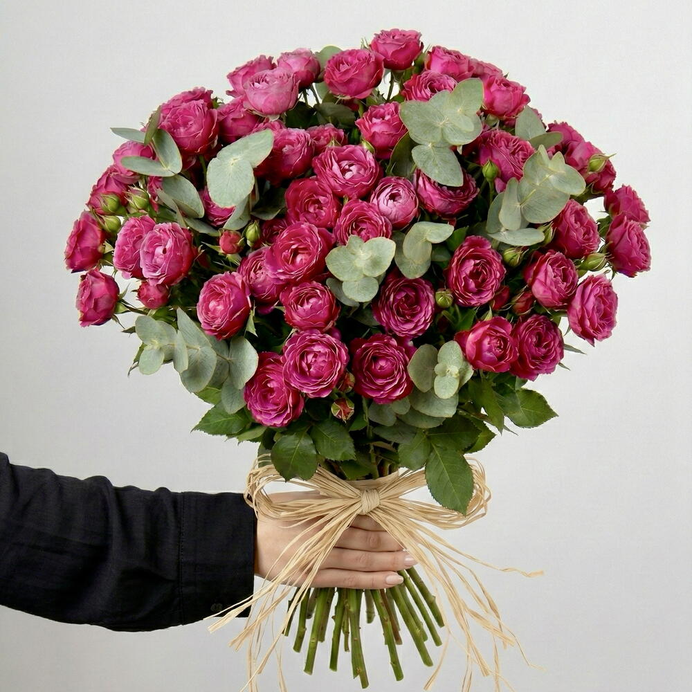 31 pink peony spray roses beautifully wrapped to create a soft, romantic, and graceful bouquet.
