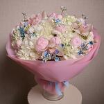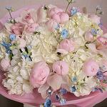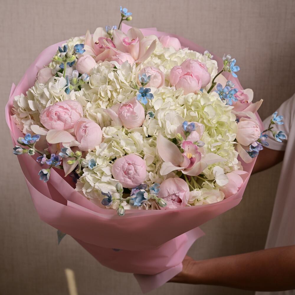 Ribbon - 1 pcs wrapping paper - 5 pcs cymbidium orchids - 5 pcs peony roses (pink) - 15 pcs hydrangeas (white) - 5 pcs oxypetalum (white) - 10 pcs