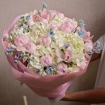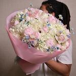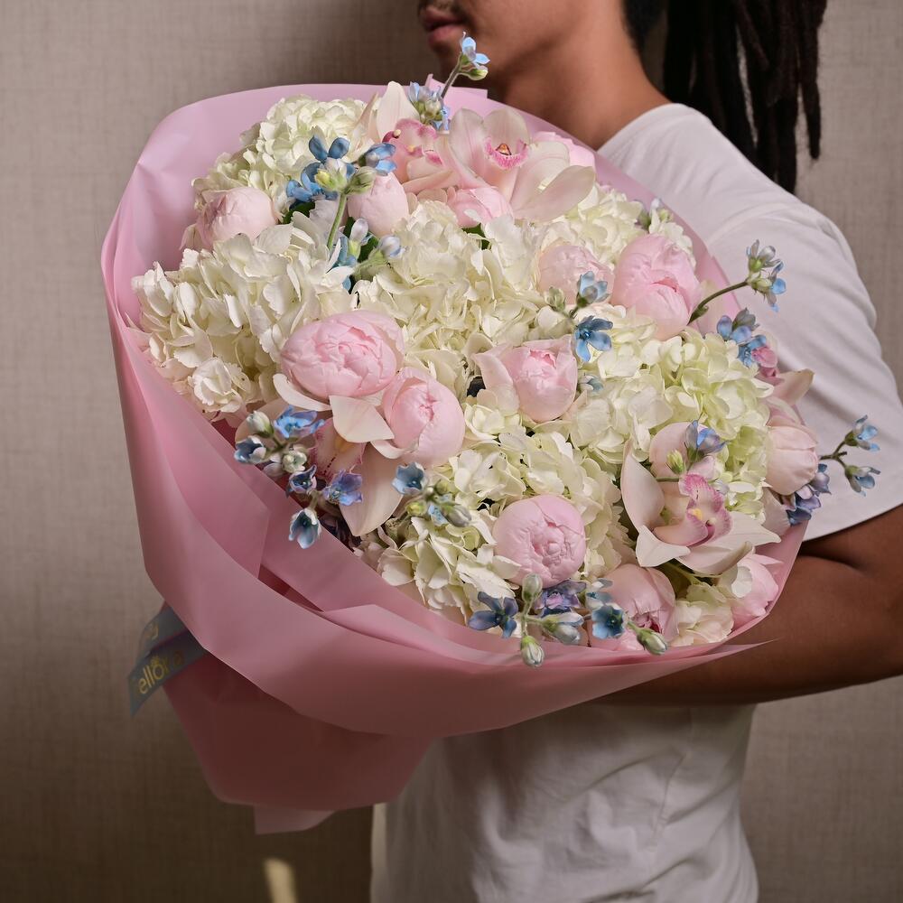 It is a sophisticated floral arrangement designed to captivate with its graceful blend of soft pink Peony Roses, pristine white Hydrangeas, and delicate Cymbidium Orchids. This stunning bouquet is a perfect gift for any celebration, including weddings, anniversaries, or special milestones. The harmonious combination of these luxurious flowers creates a timeless bouquet that conveys beauty, love, and elegance.