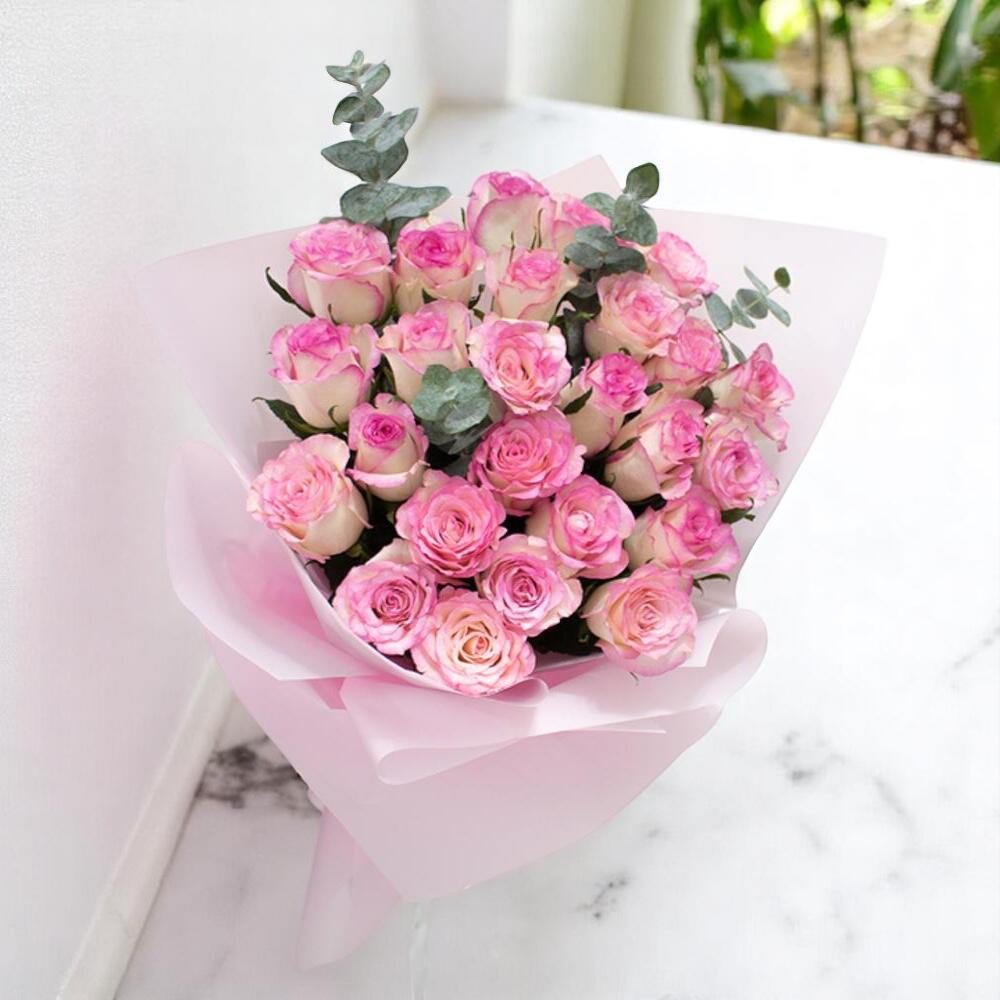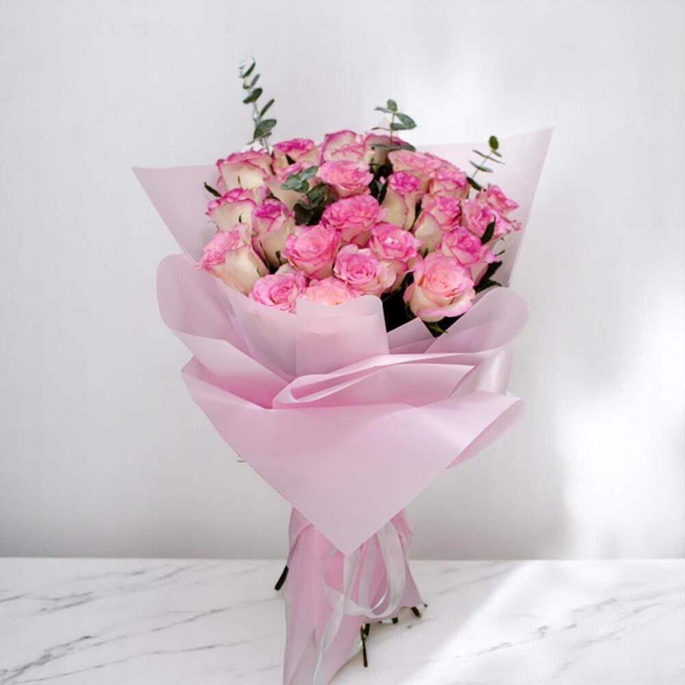 The Perapink Bouquet is a timeless expression of grace and affection, featuring a beautiful blend of soft pink and creamy white roses. Elegantly wrapped in pastel pink floral paper and accented with fresh eucalyptus, this bouquet is the perfect choice for romantic gestures, birthdays, or celebrations of love and gratitude. Its soft tones evoke warmth, tenderness, and joy. Care Recommendations: To extend the life of your bouquet, place the stems in fresh water immediately upon receipt. Keep the flowers in a cool, shaded location away from direct sunlight or heat sources. Replace the water every two days and trim the stems diagonally to help them absorb water efficiently. Remove any wilted petals or foliage to maintain the bouquet’s fresh and beautiful appearance.