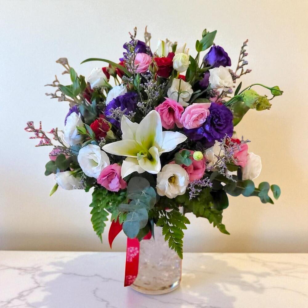 Bring a burst of vibrant elegance into any space with this enchanting floral arrangement. Featuring a stunning mix of fresh lilies, lisianthus, roses, and lush greenery, this bouquet captures the essence of joy and sophistication. The contrasting hues of purple, pink, red, and white bloom in harmony, creating a captivating and colorful display. Arranged in a chic glass vase and finished with a bright red ribbon, it’s perfect for gifting or brightening up your home. Whether it’s for a birthday, anniversary, or a heartfelt gesture, this bouquet makes every moment unforgettable. Radiating charm, beauty, and warmth — it’s a true floral masterpiece.