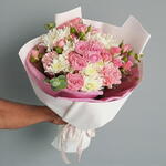 Eucalyptus - 3 pcs Wrapping - 2 pcs pink spray rose - 4 pcs white chrysanthemum - 3 pcs pink carnation - 3 pcs tissue - 1 pcs