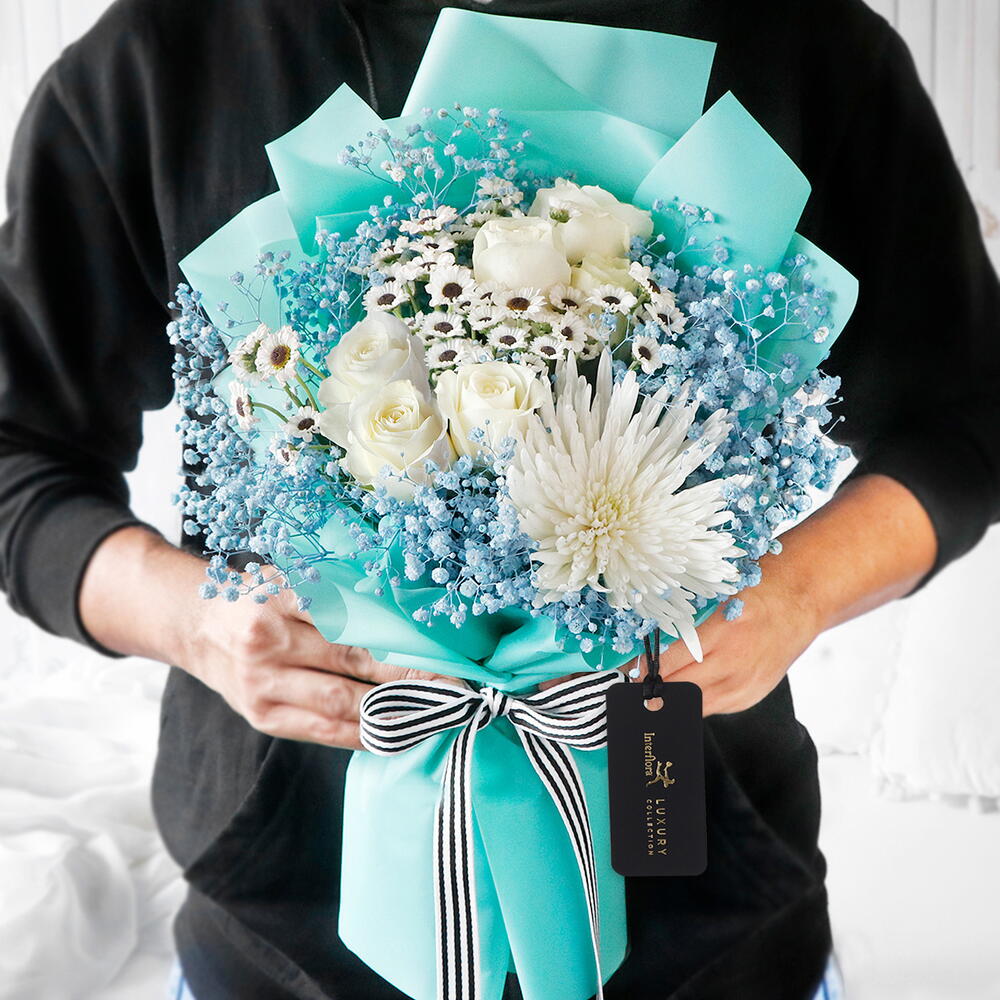 Center of your galaxy, the love of your life, the one of your dreams - hand tied with love. Type of Flowers: Roses ,Disbuds ,Saintiny White ,Gypso No. of Stems: 11 Colour of Flower: Assorted
