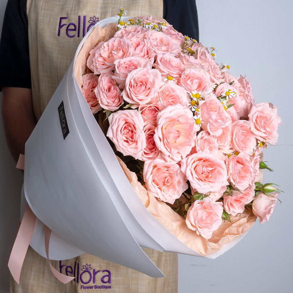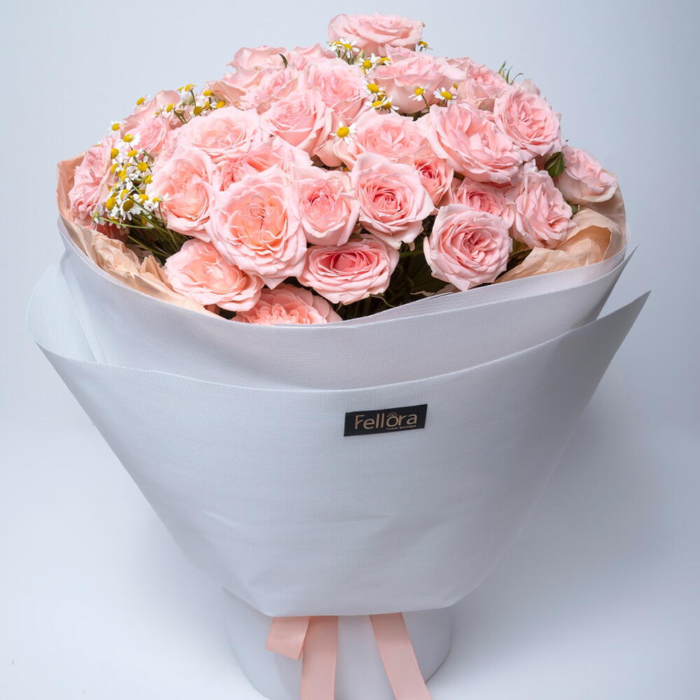 Ribbon - 1 pcs wrapping paper - 4 pcs tanacetum spray daisy - 5 pcs sweet sara spray rose - 15 pcs