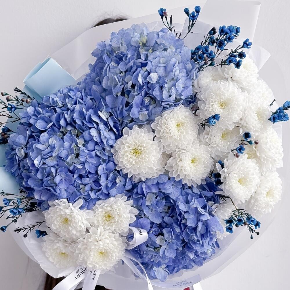 Blue statice - 8 pcs Chrysanthemum white - 20 pcs hydrangea blue - 5 pcs