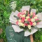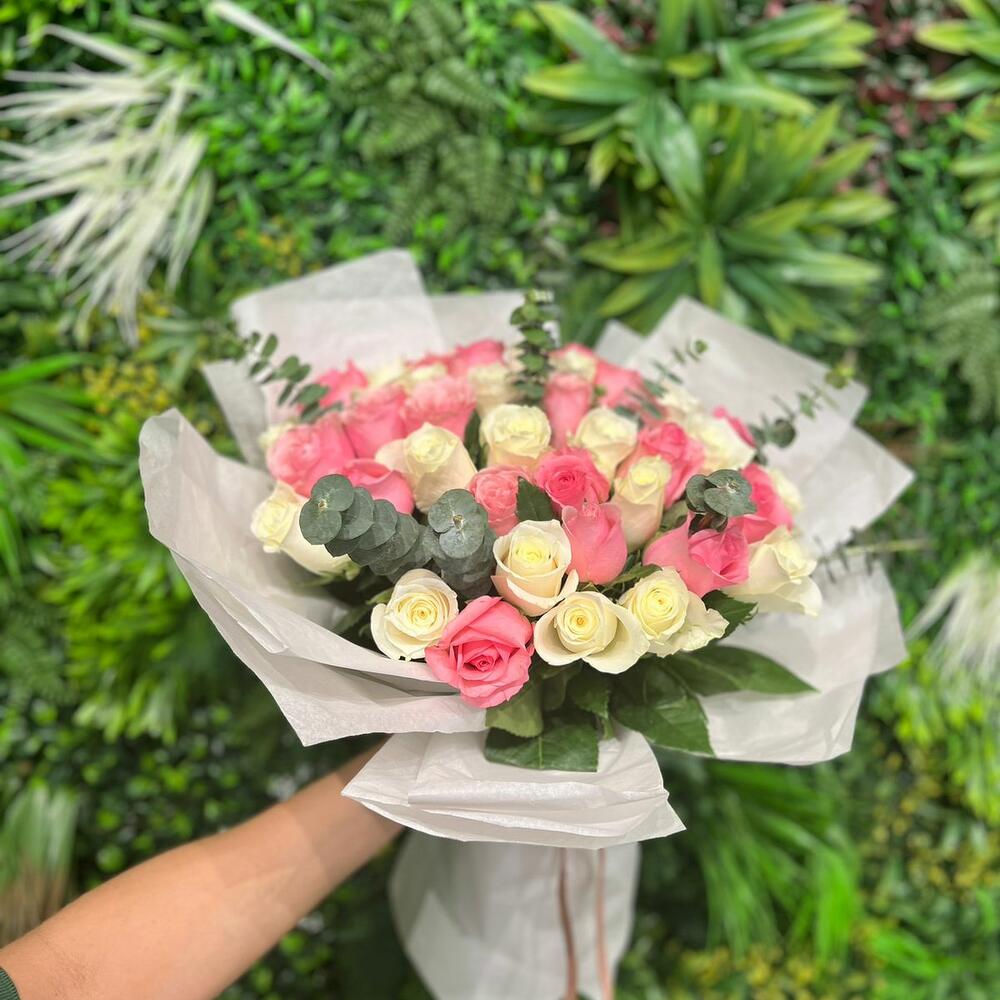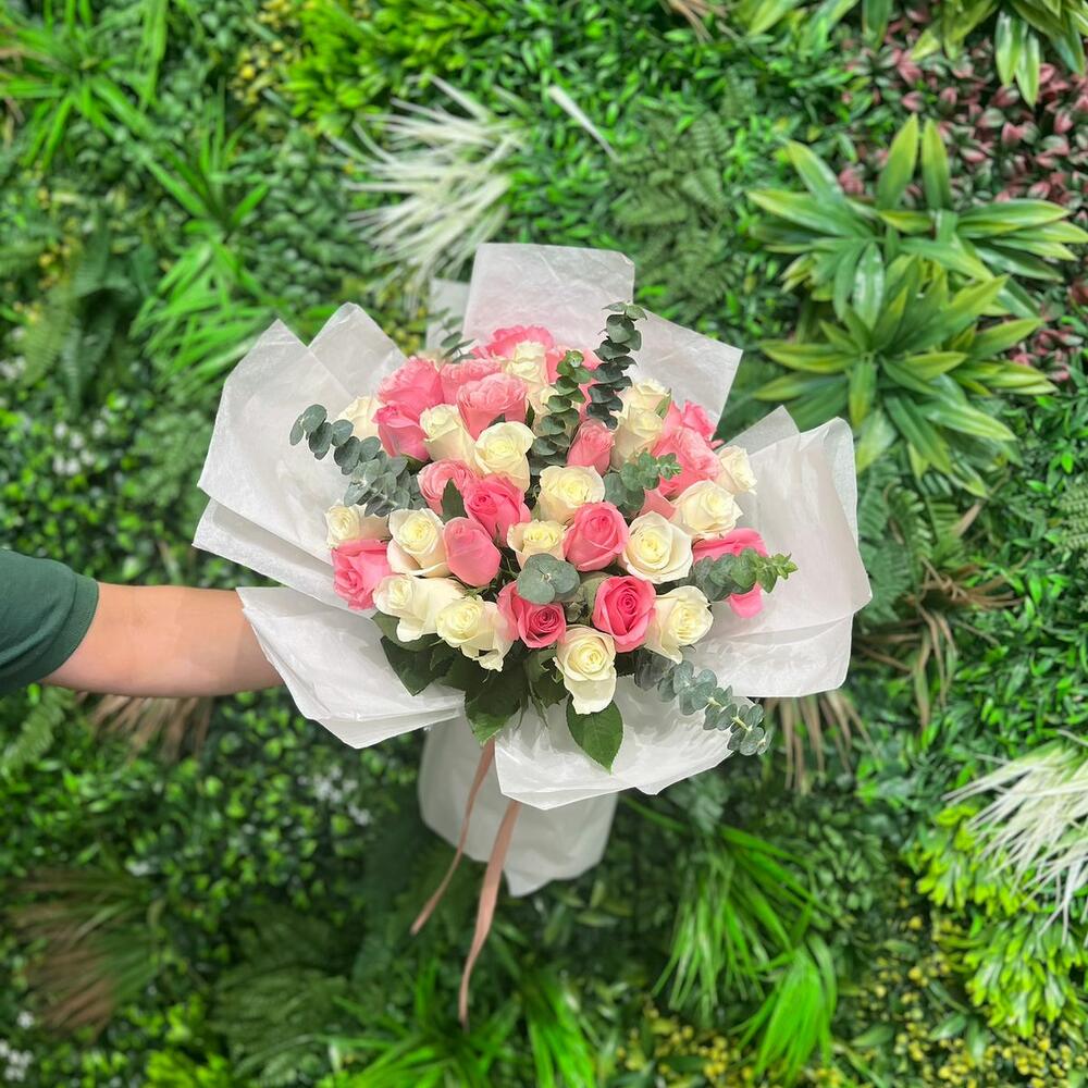 Pink rose - 21 pcs White rose - 20 pcs eucalyptus baby blue - 8 pcs