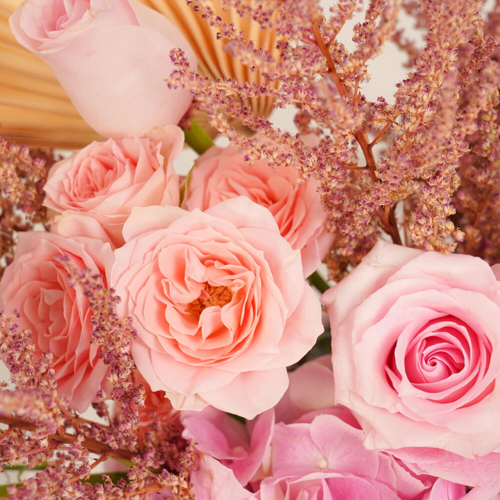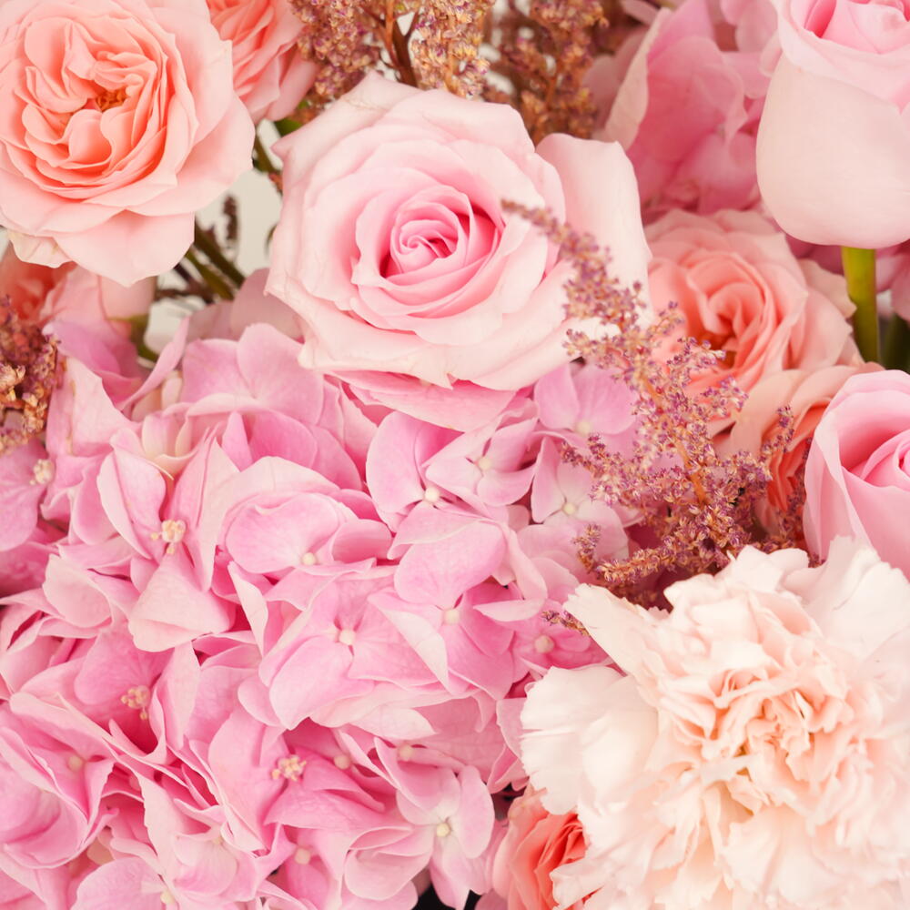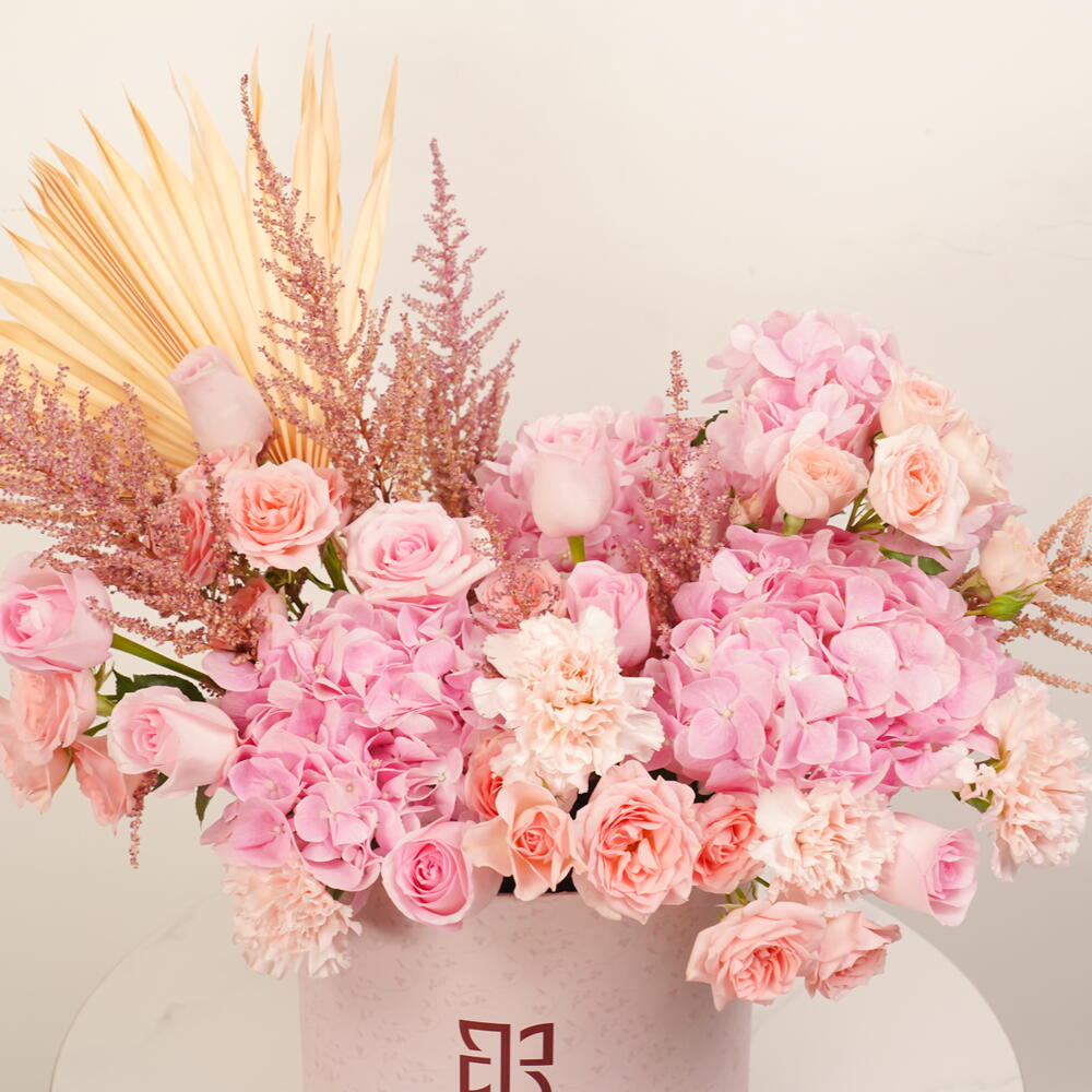 rose pink - 20 pcs hydrangea pink - 5 pcs carnation pink - 10 pcs spray rose pink - 10 pcs dry palm leaves - 2 pcs zezzle round pink box - 1 pcs astilpe pink - 5 pcs