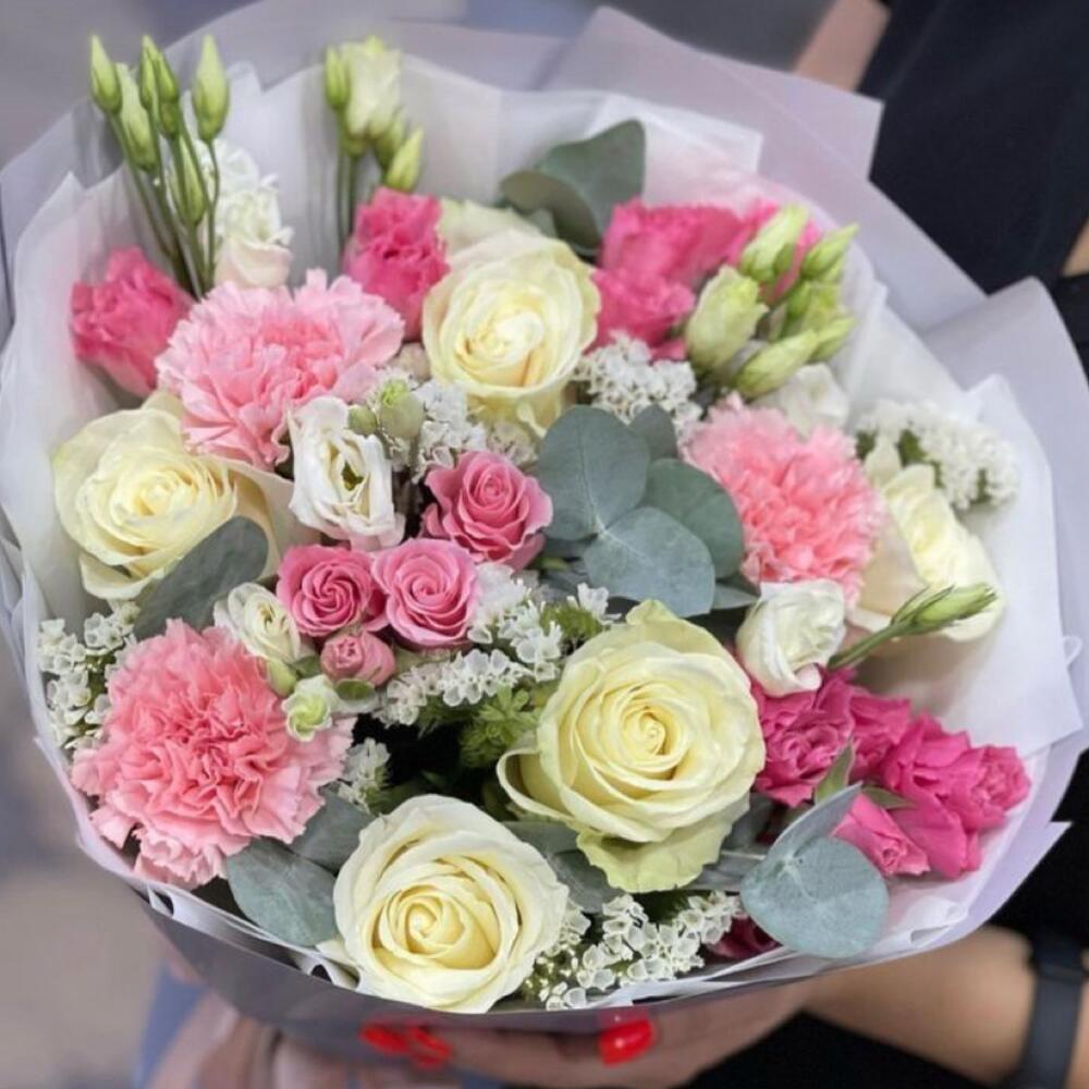 White rose - 5 pcs pink carnations - 3 pcs pink eustoma - 3 pcs white lisianthus - 3 pcs wrapping paper - 4 pcs white statice stems - 6 pcs eulcyptus - 4 pcs odelia pink spray rose - 1 pcs
