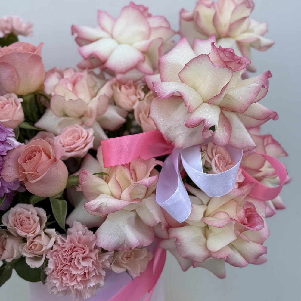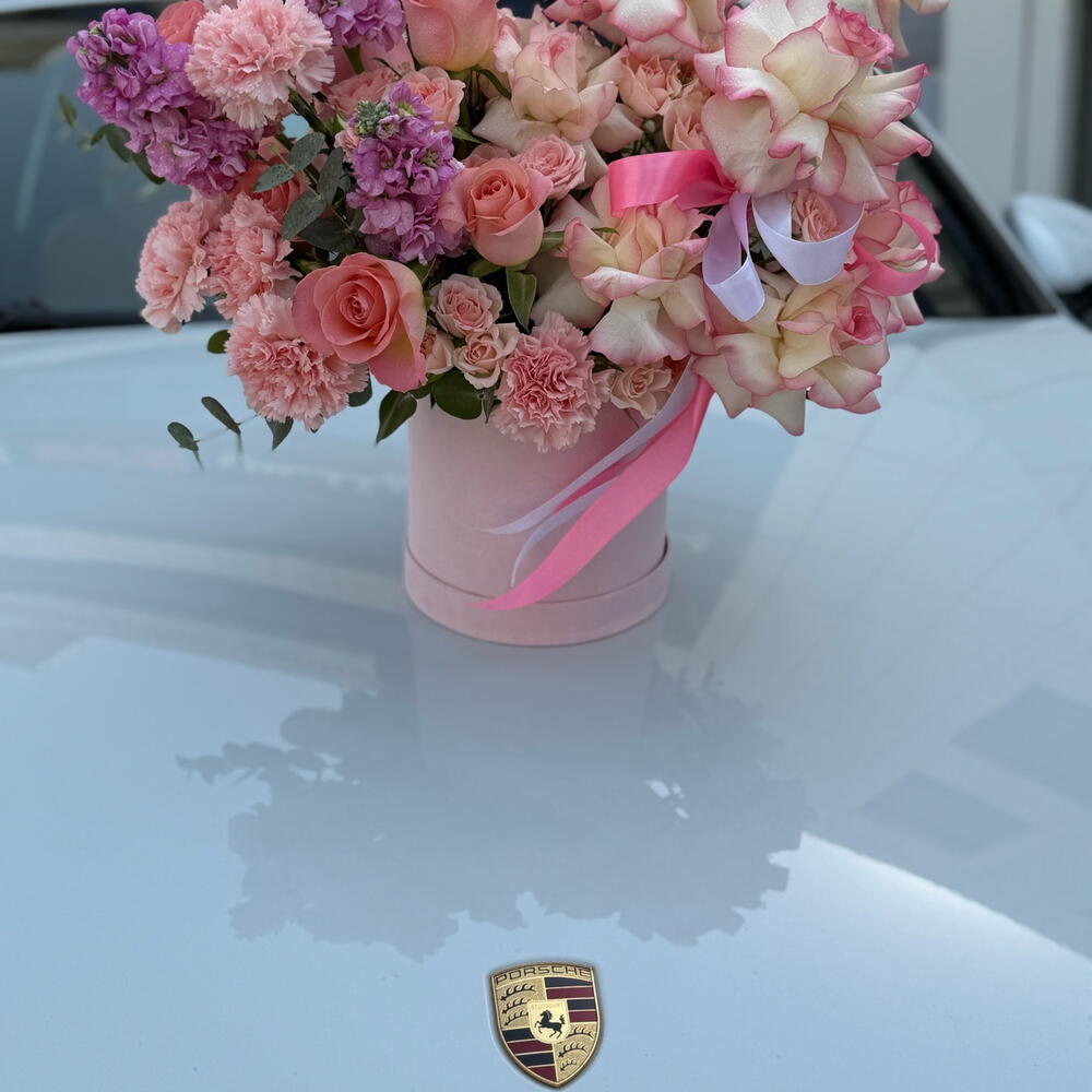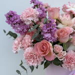 Meet Pink Blooms — a joyful, luxury birthday box arrangement that’s bursting with colour, texture, and romance. Designed in a chic pink hat box with ribbons, this fresh flowers bouquet features premium two-tone pink roses (pink-edged roses), classic peach/pink roses, delicate pink spray roses, fluffy pink carnations, and vibrant purple stock stems for height and fragrance — creating a gorgeous mixed flowers bouquet / mix flowers bouquet that feels trendy and truly special. Perfect as a Birthday Bouquet and one of the best birthday bouquet choices, it’s ideal for birthday flowers, flowers for birthday, and memorable birthday gifts in Dubai. With its soft tones and romantic rose styling, it also works beautifully as a congratulations bouquet, a sweet anniversary surprise, or elegant love and romance flowers. If you’re looking for a premium flowers bouquet with premium quality flowers and a standout pink flowers bouquet look, Pink Blooms is a unique, photo-ready pick for the best bouquet in Dubai.