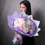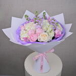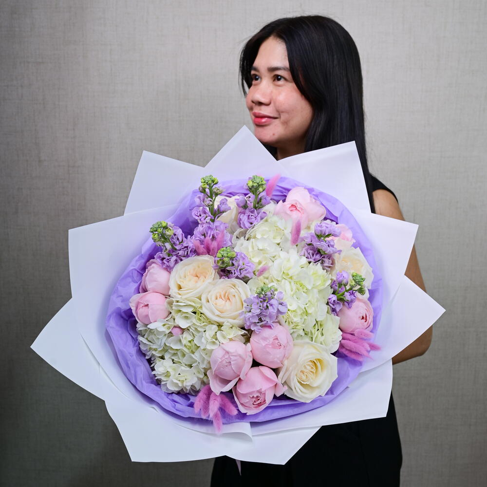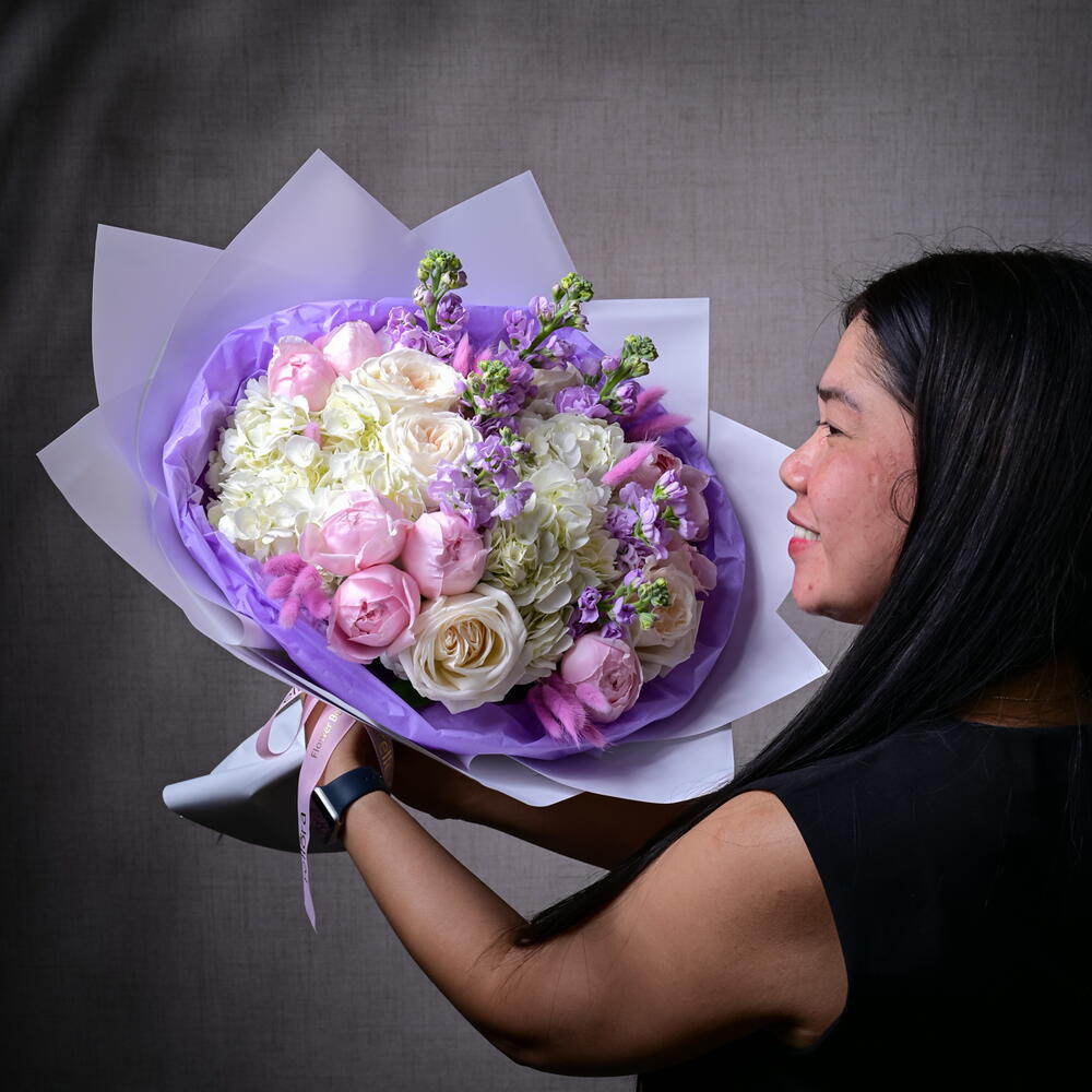 Ribbon - 1 pcs Hydrangea - 3 pcs matthiola - 5 pcs wrapping paper - 5 pcs bunny tail - 10 pcs peony roses - 9 pcs ohara roses - 5 pcs