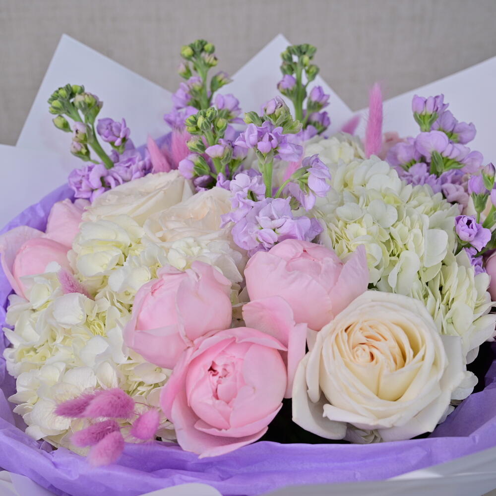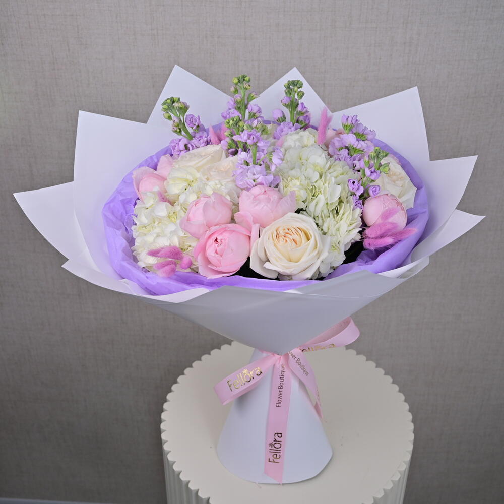 The Pink Blush Bouquet features a beautiful blend of 9 Peony Roses, 5 Ohara Roses, 5 Matthiola Stems, 3 Hydrangea Stems, and 10 Bunny Tail Stems, combining soft pinks and delicate whites for a romantic and elegant floral display. Perfect for any special occasion, crafted with care and delivered fresh from Fellora Flower Boutique.