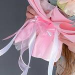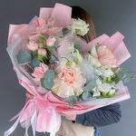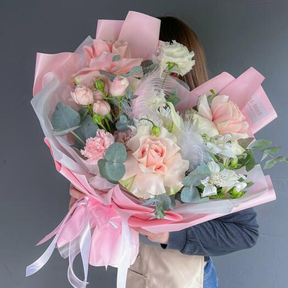 A delicate bouquet in a powdery pink palette of French pink roses, white chrysanthemums, white alstroemerias, carnations, peony-shaped bush roses with eucalyptus in a branded package with delivery.