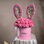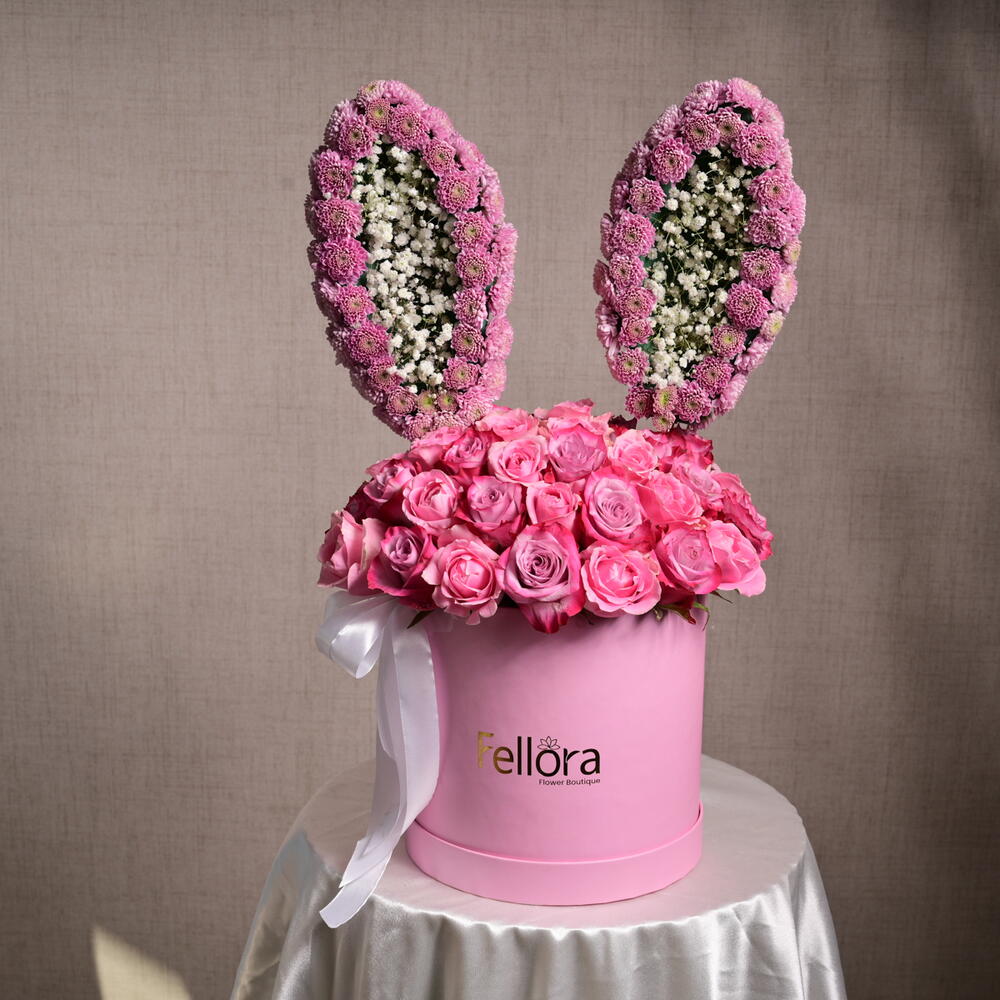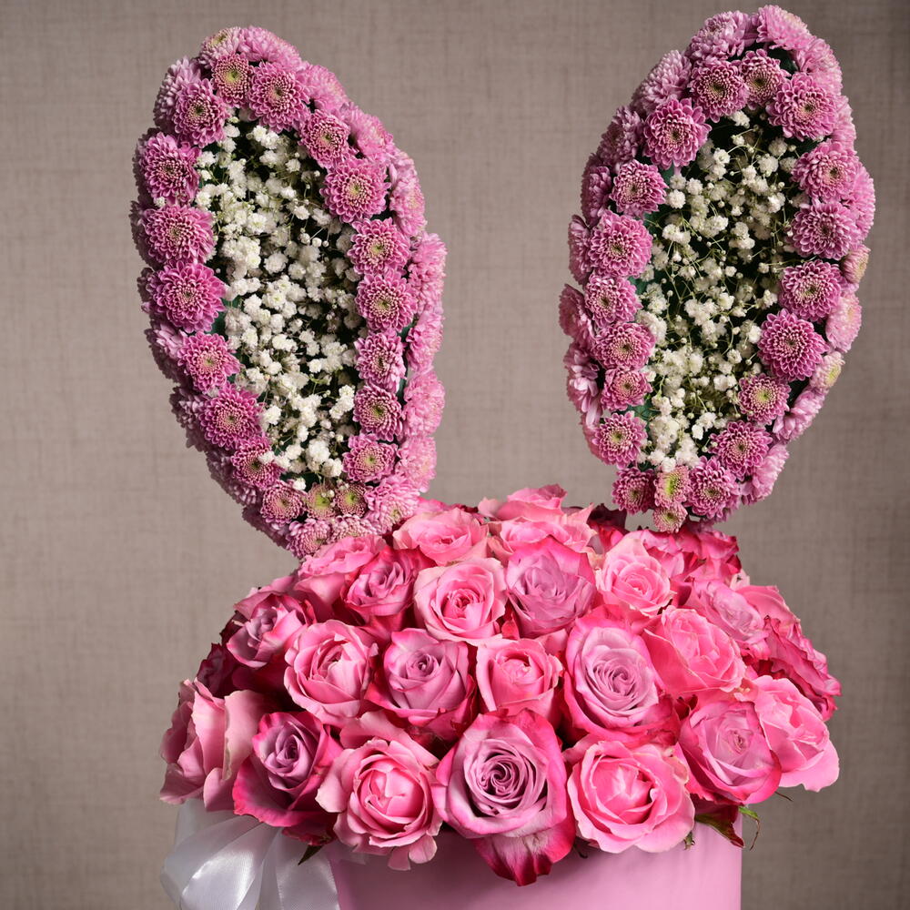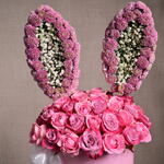 This arrangement features 49 pink roses, 3 gypsophilia stems, and 20 chrysanthemums, creatively arranged to resemble bunny ears, making it a perfect gift for Easter or any fun celebration.