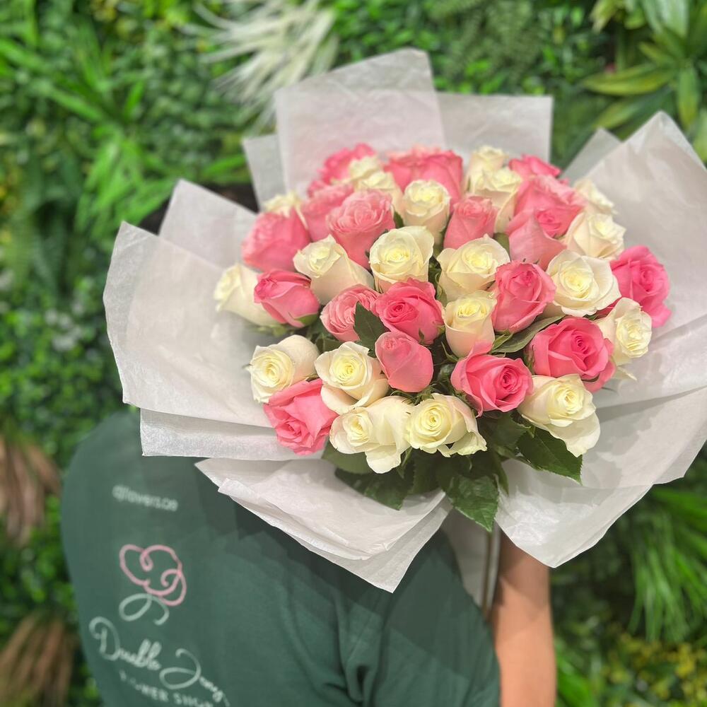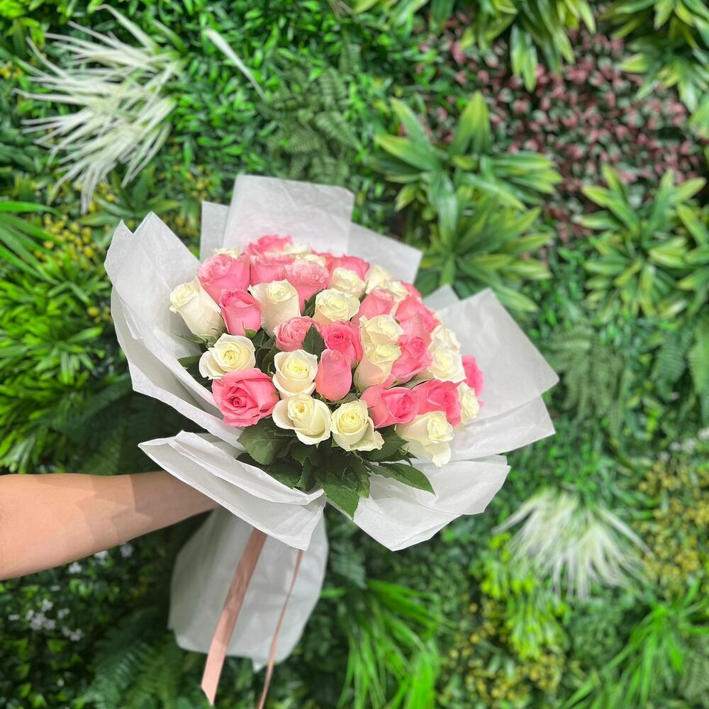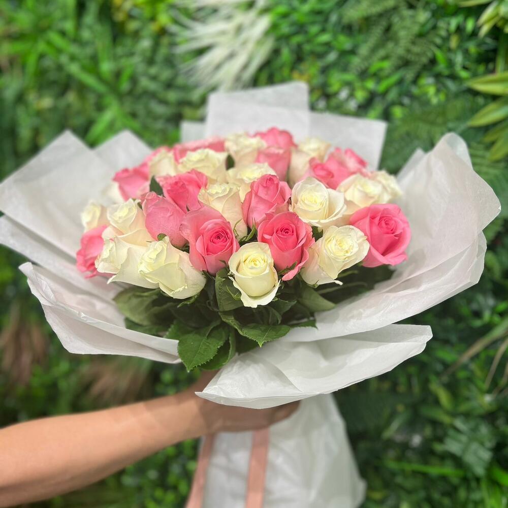 A beautiful bouquet of roses in white and soft pink shades. Elegant wrapping and branded ribbon.