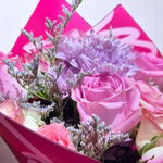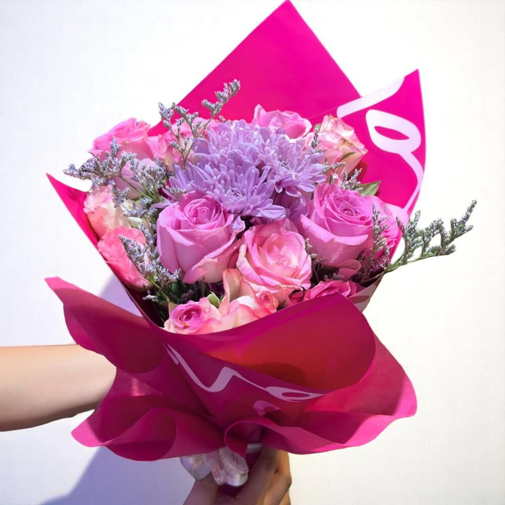 Introducing the Pink Delight Bouquet, a radiant blend of soft elegance and joyful color. This stunning floral arrangement features delicate pink roses paired with a single blooming lavender chrysanthemum, accented by airy limonium and blush-toned wrapping. Ideal for birthdays, anniversaries, or spontaneous surprises, it captures charm and affection in every bloom. Wrapped in vivid pink paper and tied with love, it’s a bouquet that speaks straight from the heart. Care Recommendations: Place the bouquet in a clean vase filled with room temperature water. Keep it in a cool, shaded spot away from direct sunlight and heat. Change the water every two days and re-cut the stems at an angle to keep the flowers hydrated and fresh. Remove any leaves submerged in water to prevent bacterial growth.
