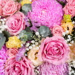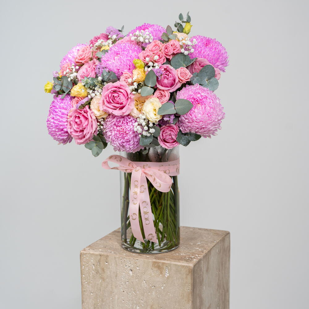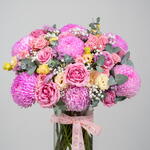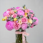 Gypsophila - 1 pcs Vase - 1 pcs eustoma peach - 3 pcs spray rose pink - 5 pcs chrysanthemum peonies pink - 7 pcs rose wham pink - 8 pcs
