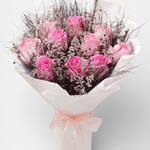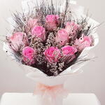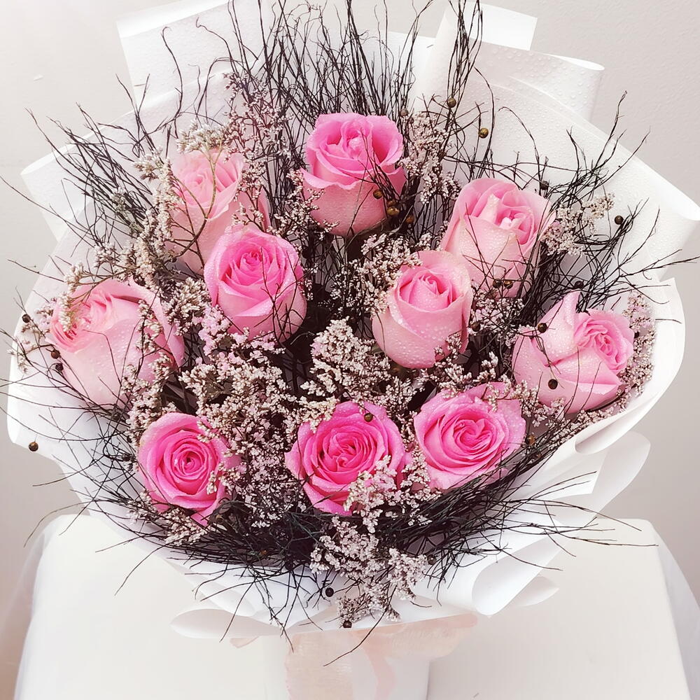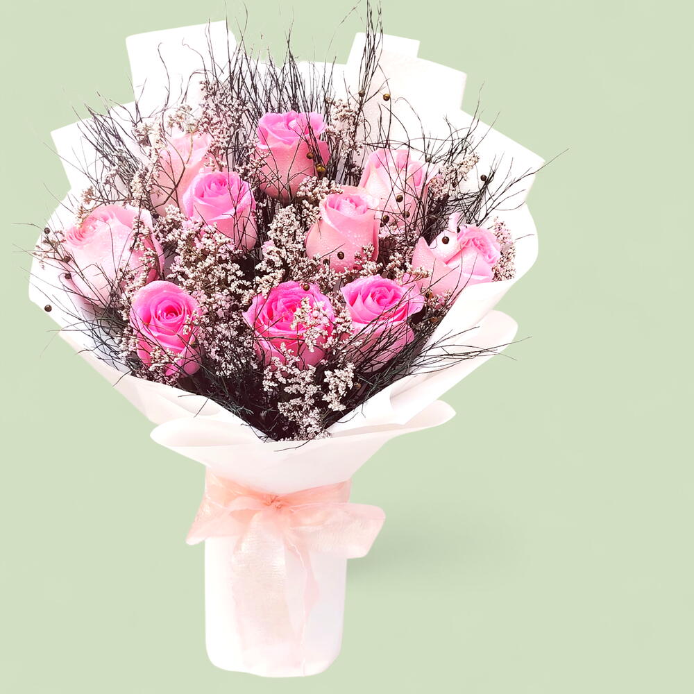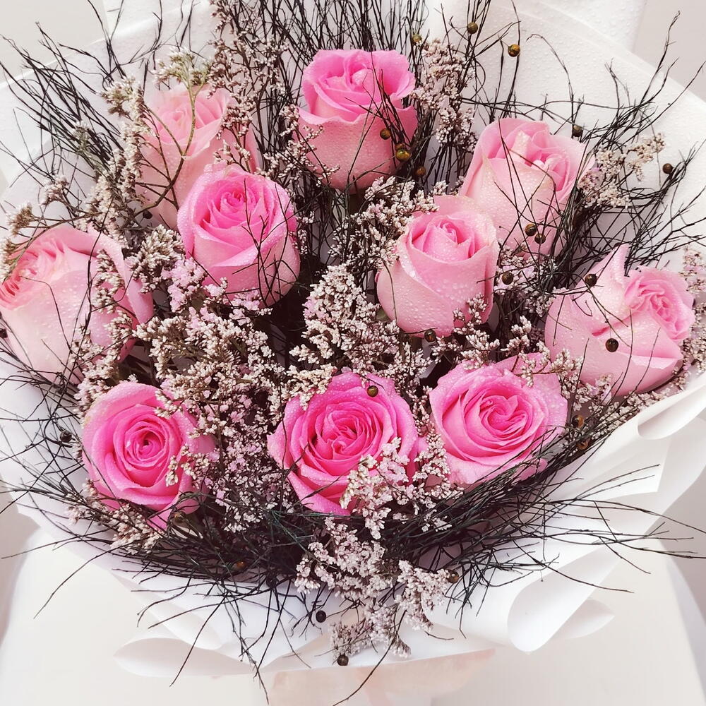 Pink rose - 10 pcs green grass - 6 pcs limonium white - 5 pcs